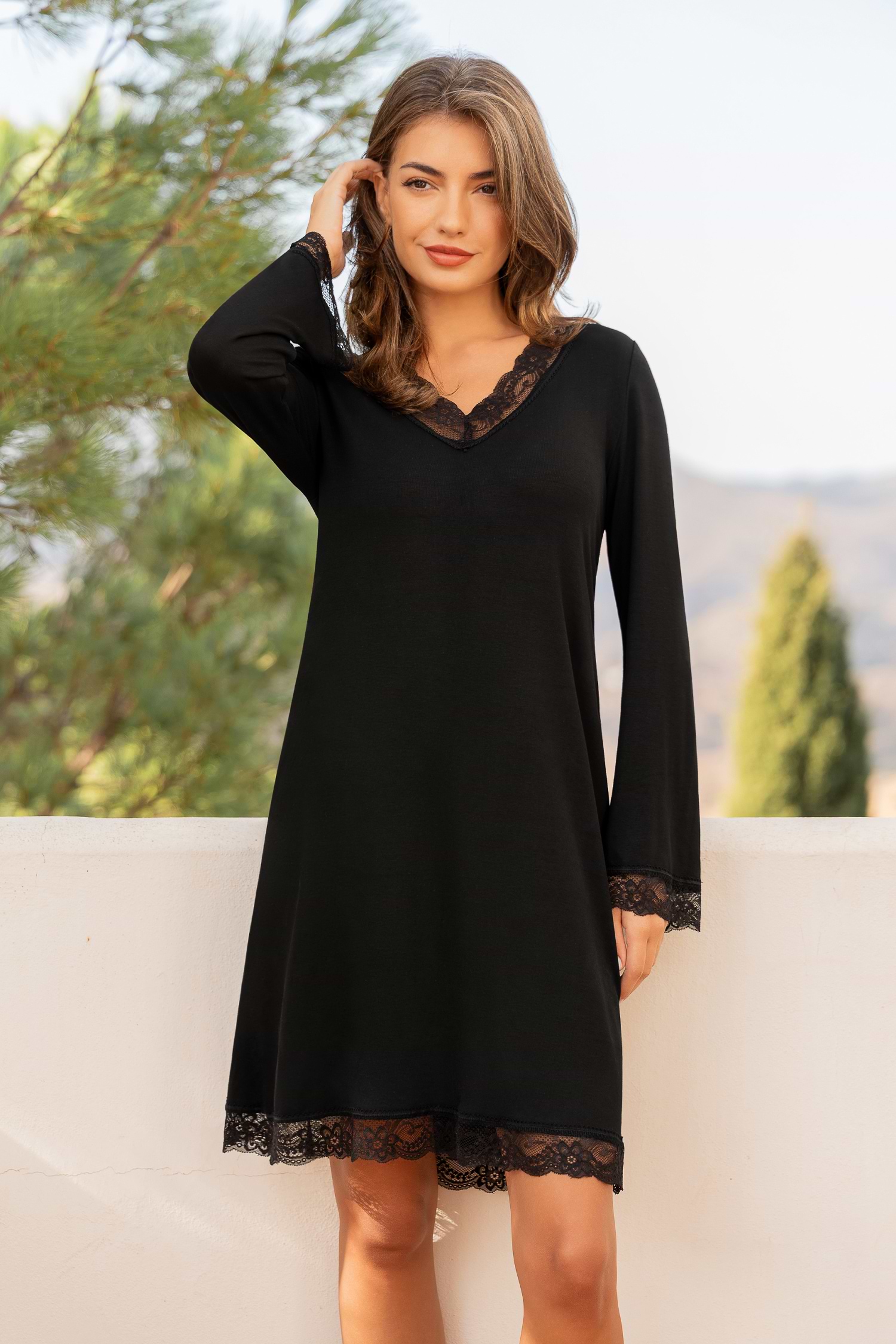 The After Dark Black Sleep Dress brings a hint of allure to your downtime. Designed with a V-neckline, delicate lace trim, and long sleeves, this mini dress blends comfort with a touch of romance for effortlessly dreamy nights.