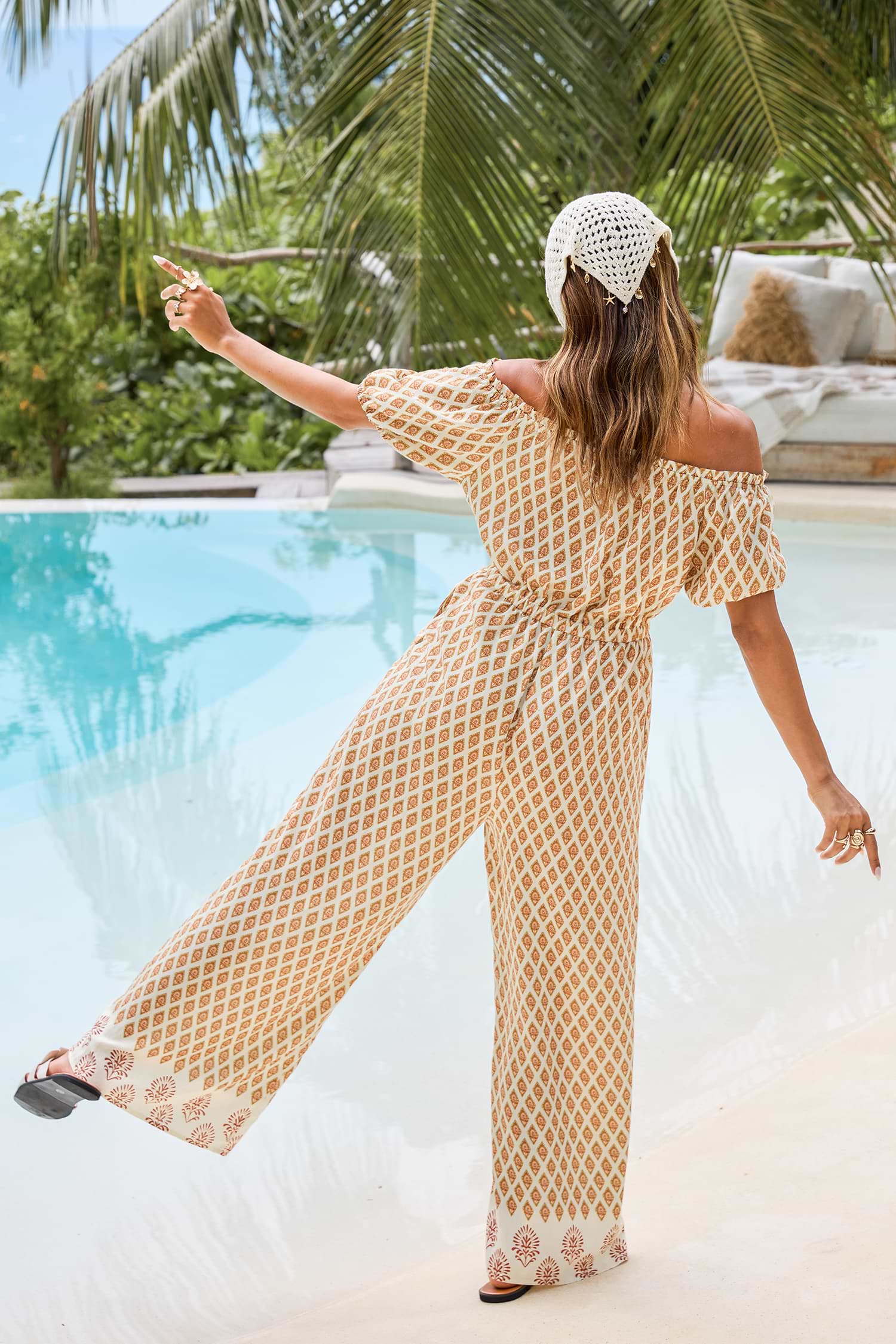 The At Sunset Geo Jumpsuit is playful, sunkissed, and made for warm-weather vibes! The off-shoulder design, short sleeves, and wide leg silhouette create a breezy, effortless look.