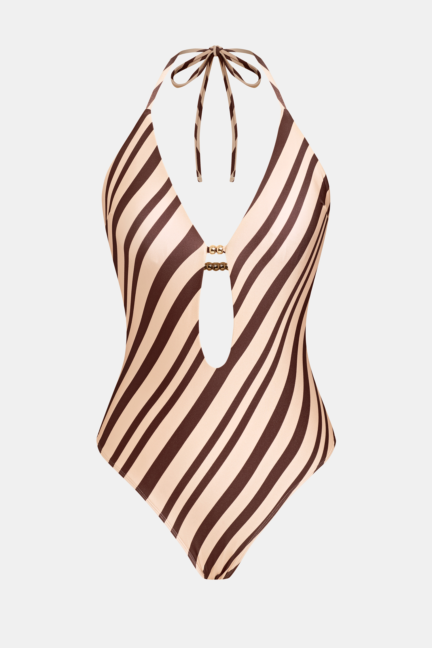 Embrace effortless getaway vibes in the Bimini Escape Striped One-Piece Swimsuit! The plunging neckline with halter straps gives light bust support, while the high-cut leg creates a flirty, fun, and playful look.