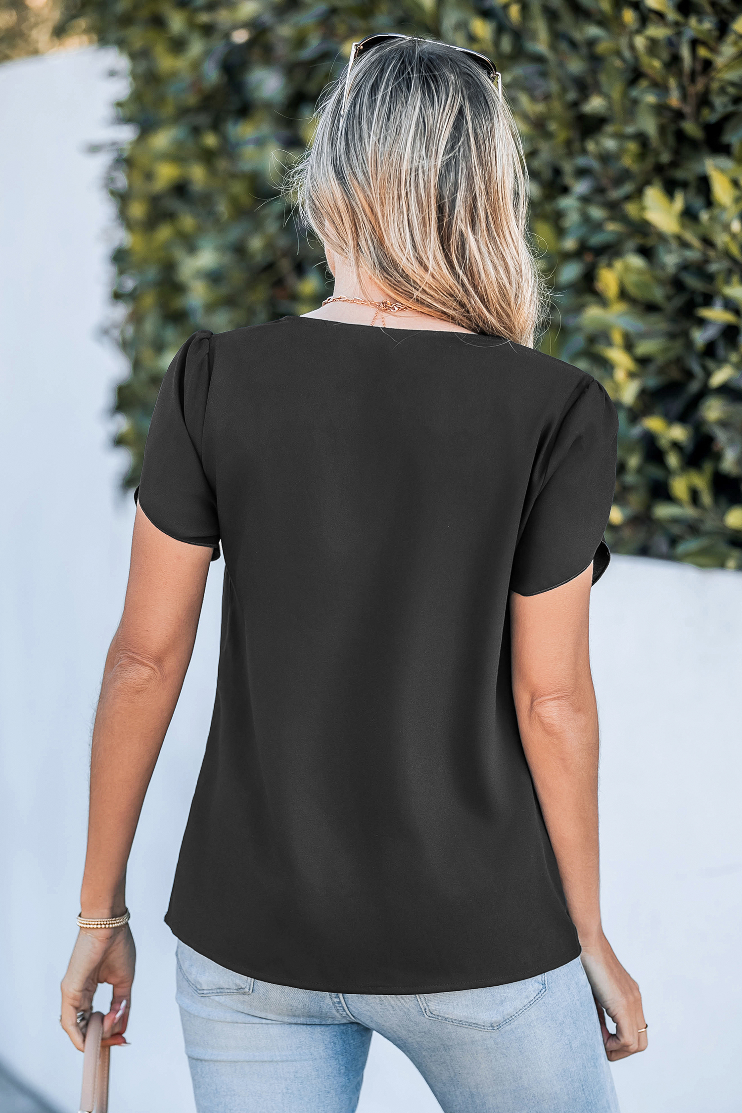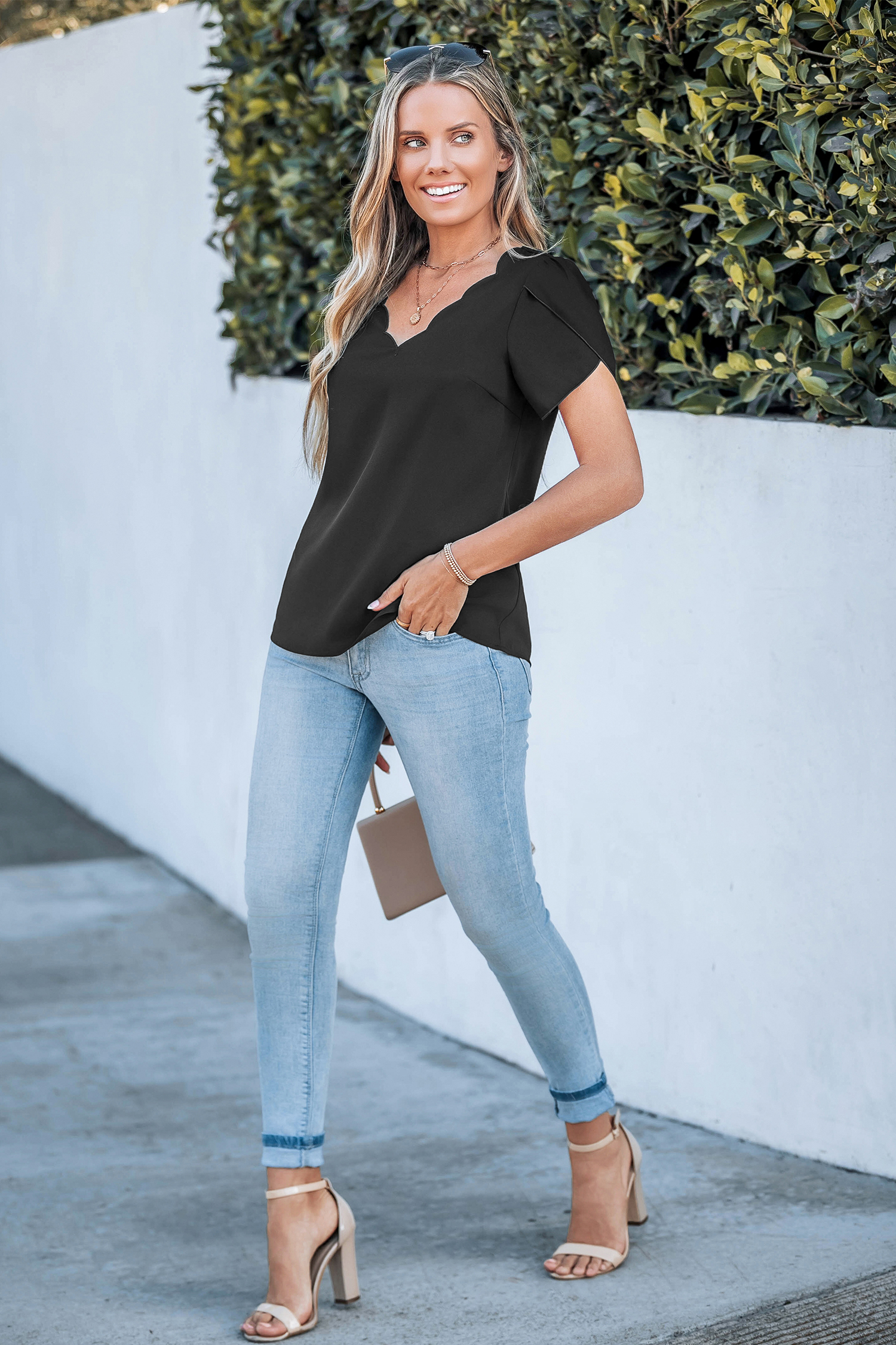 HomeBlack Scalloped V-Neck Puff Sleeve Top