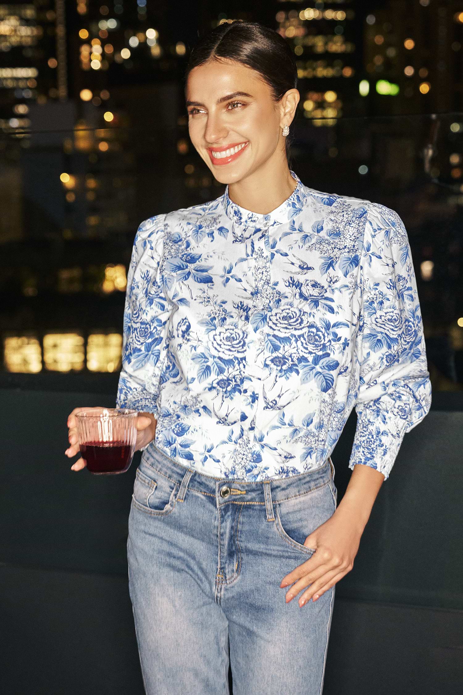 Blue & White Floral Puff Sleeve Standing Collar Blouse