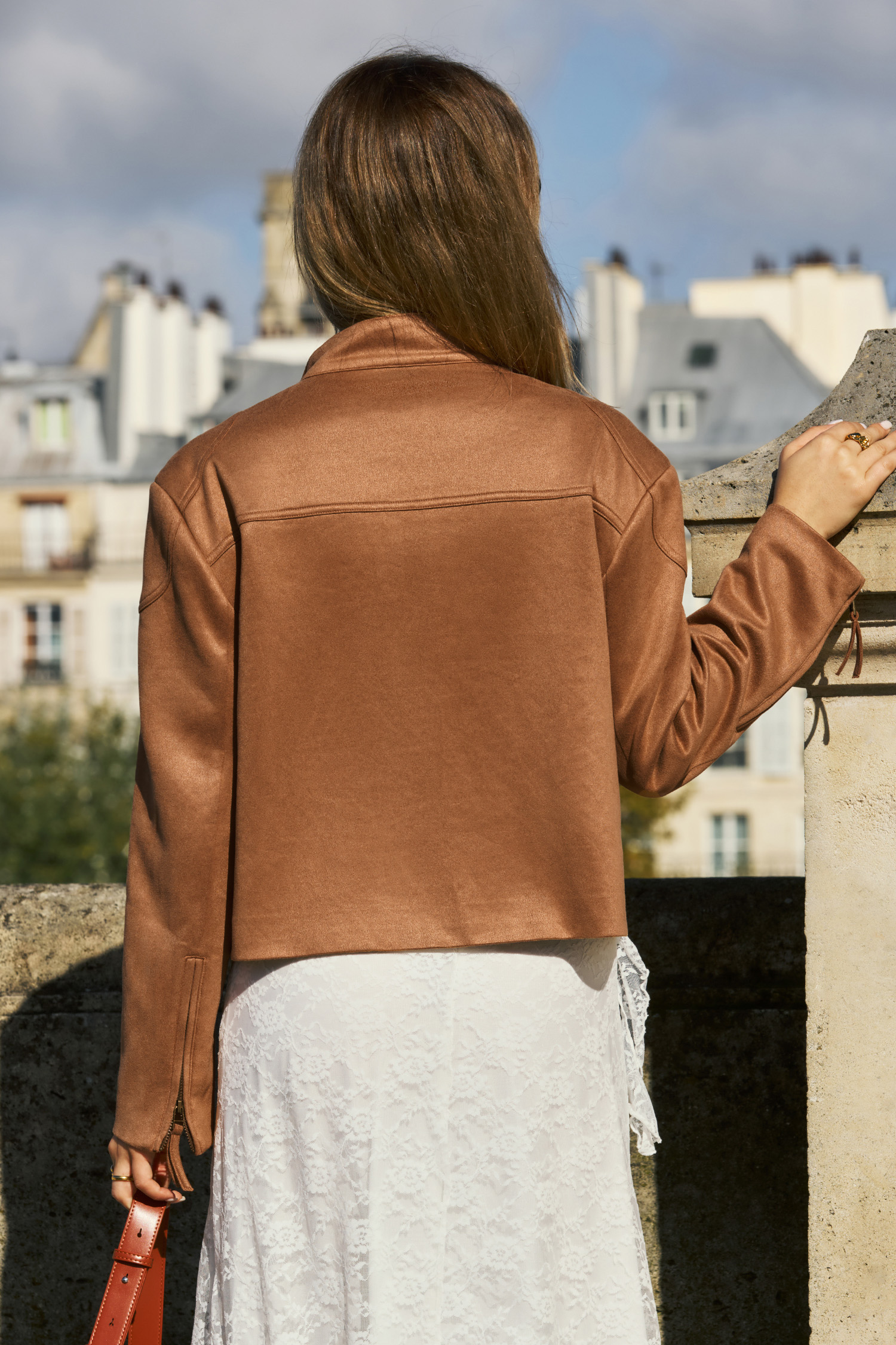 This Brown Faux Suede Standing Collar Jacket has just the right mix of cool and casual. With a buttoned standing collar, front zipper, and handy side zip pockets, it’s made for easy layering and all-day comfort.
