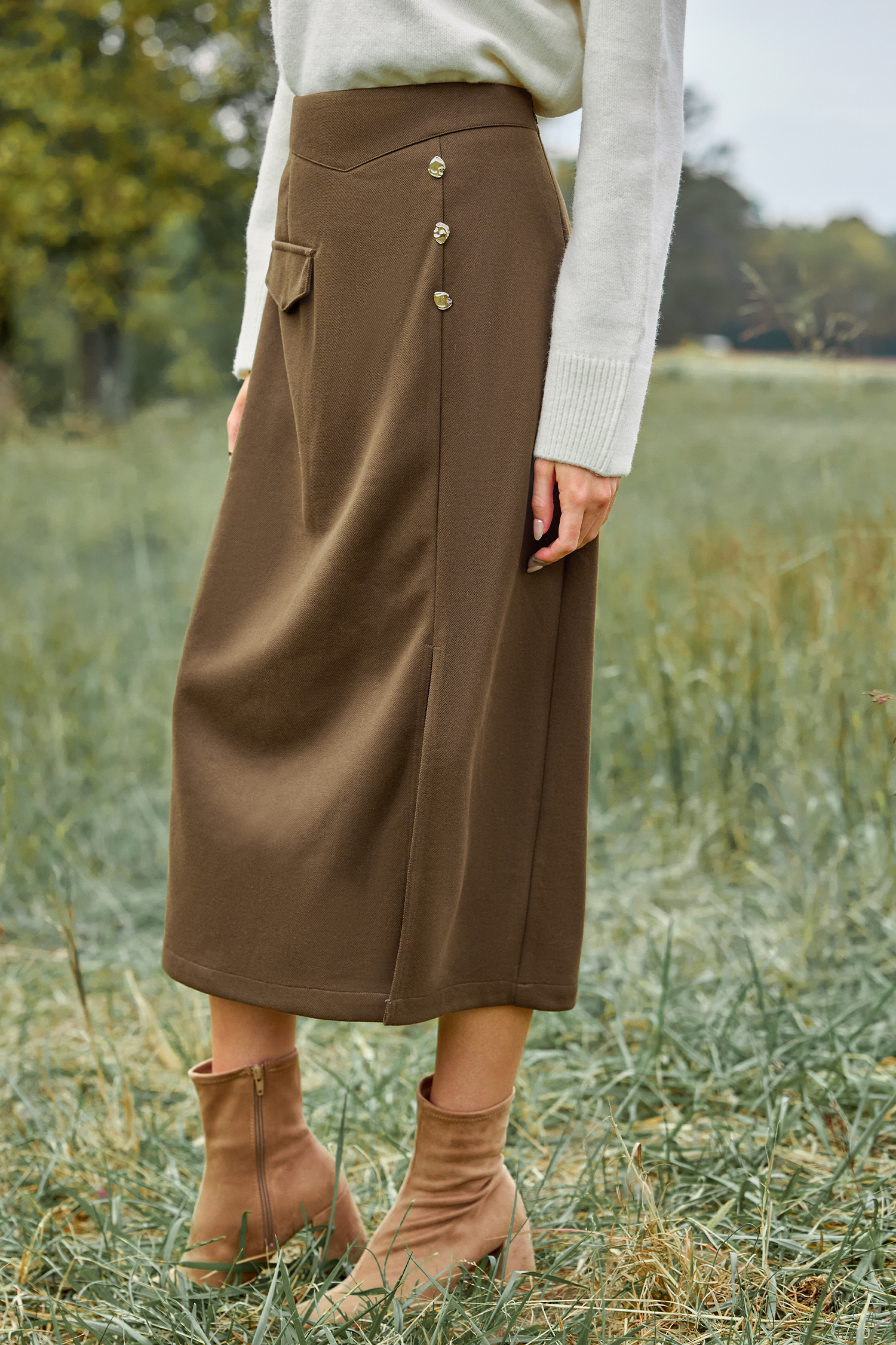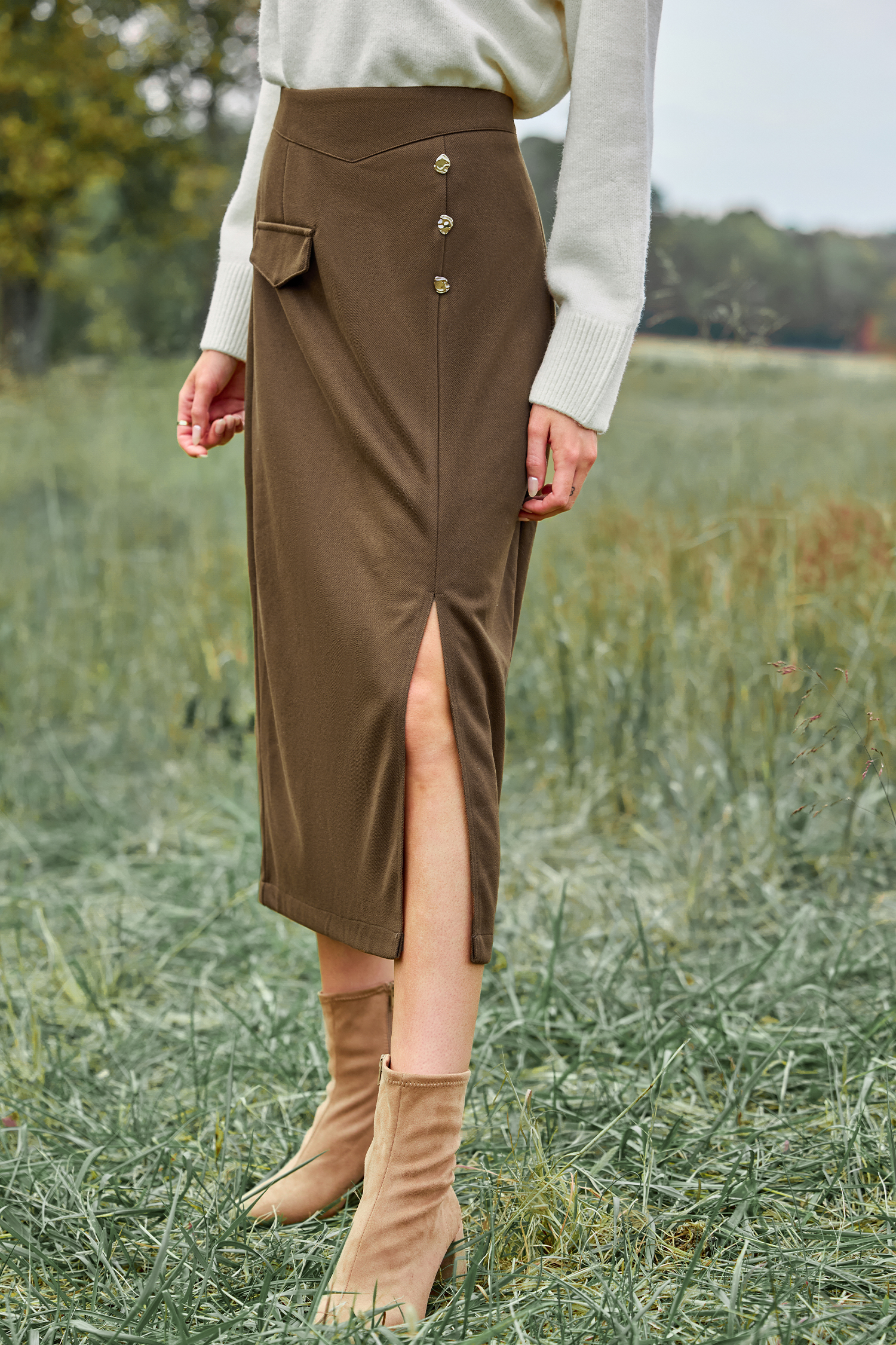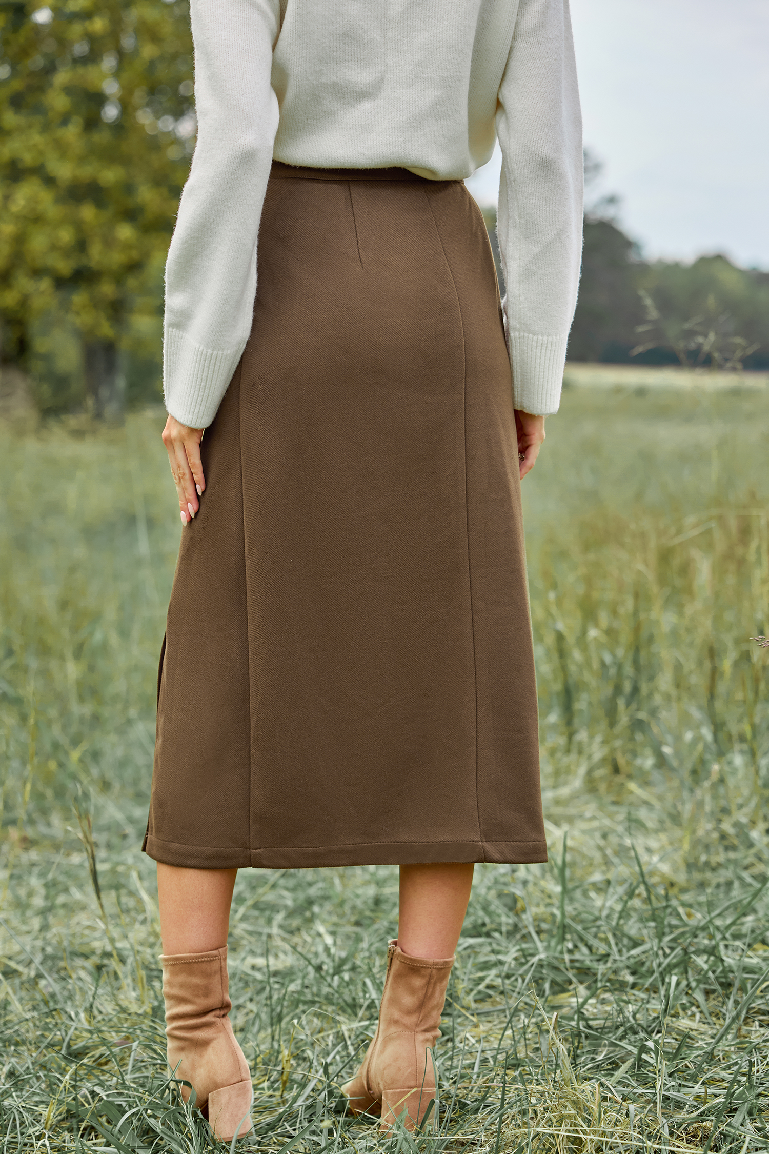 Want to elevate your everyday style? The Brown Split Hem Midi Skirt features a chic split detail that adds movement, making it a versatile choice for any occasion.