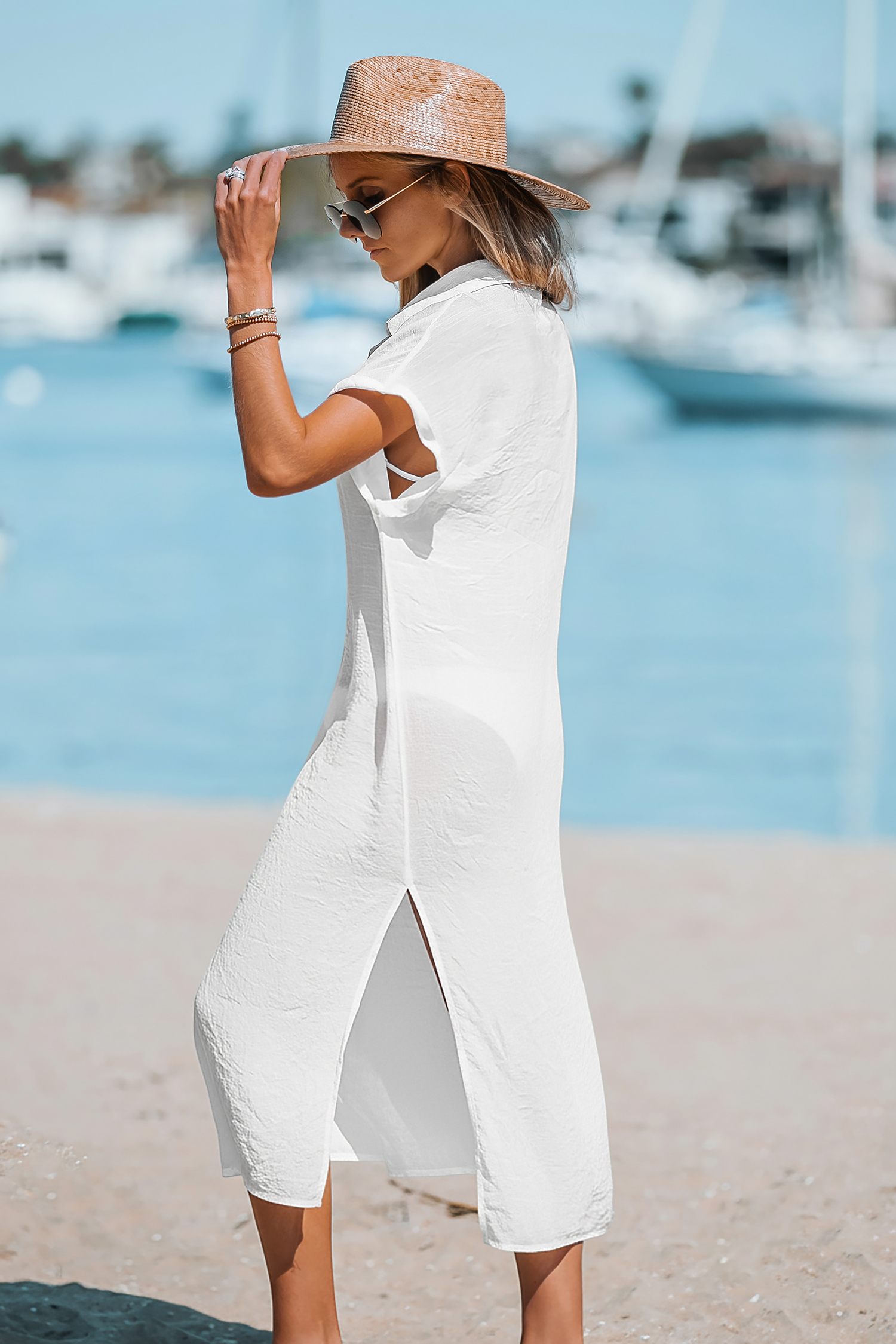This style is made from a lightweight, semi-sheer fabric that appears more transparent in bright light and is designed to be worn as a cover-up. This buttoned cover-up midi dress is the perfect blend of effortless elegance and beachy vibes.
