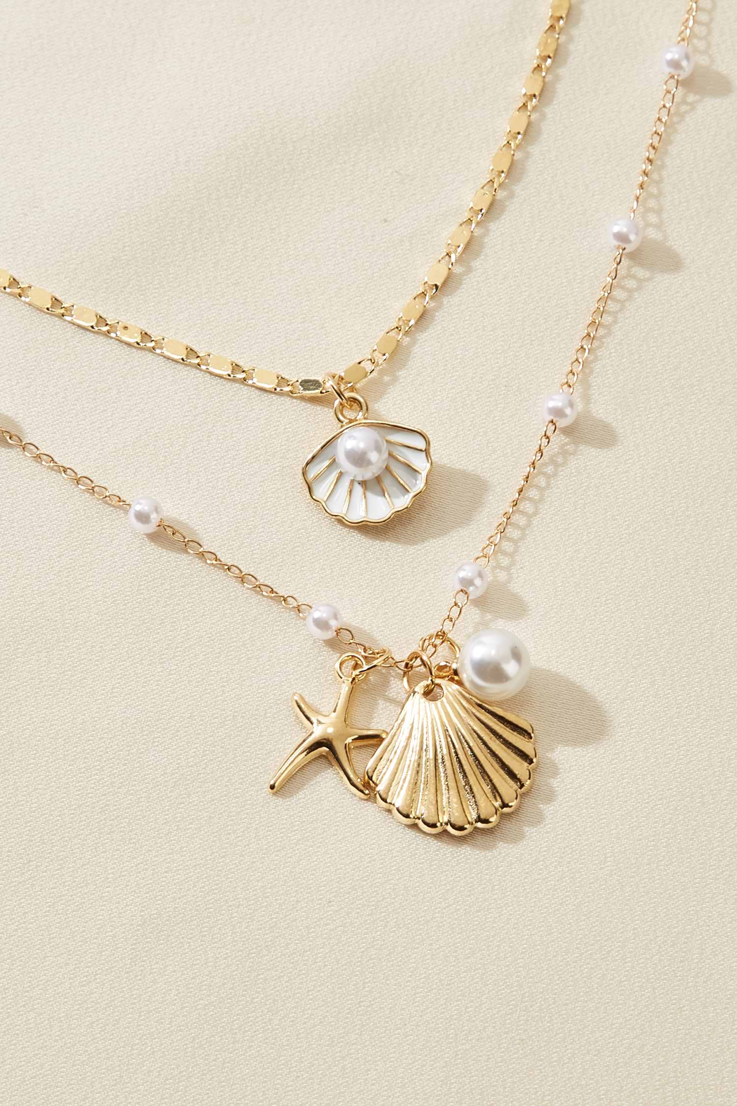 The Cabana Nights Gold-Tone Necklace Set brings effortless beach vibes! Faux pearl accents and beach motif details layer together for a stylish, seaside-inspired look.