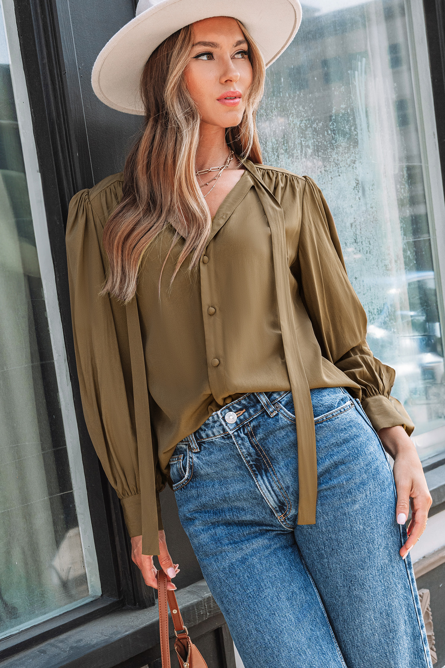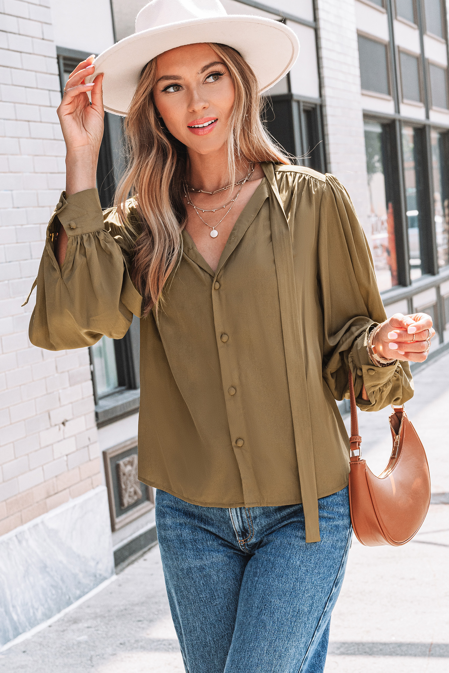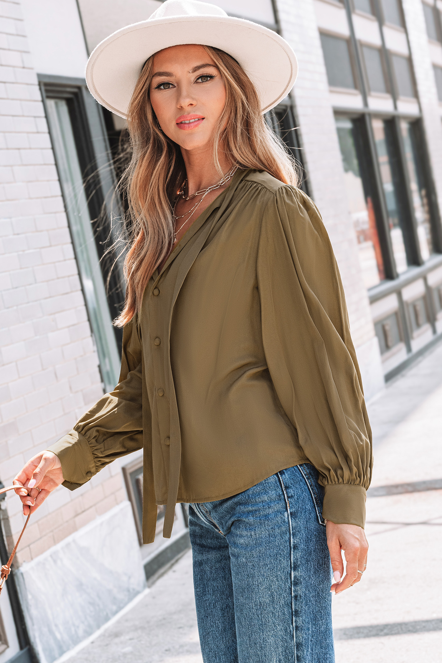 HomeCamel Tie Neck Puff Sleeve Blouse