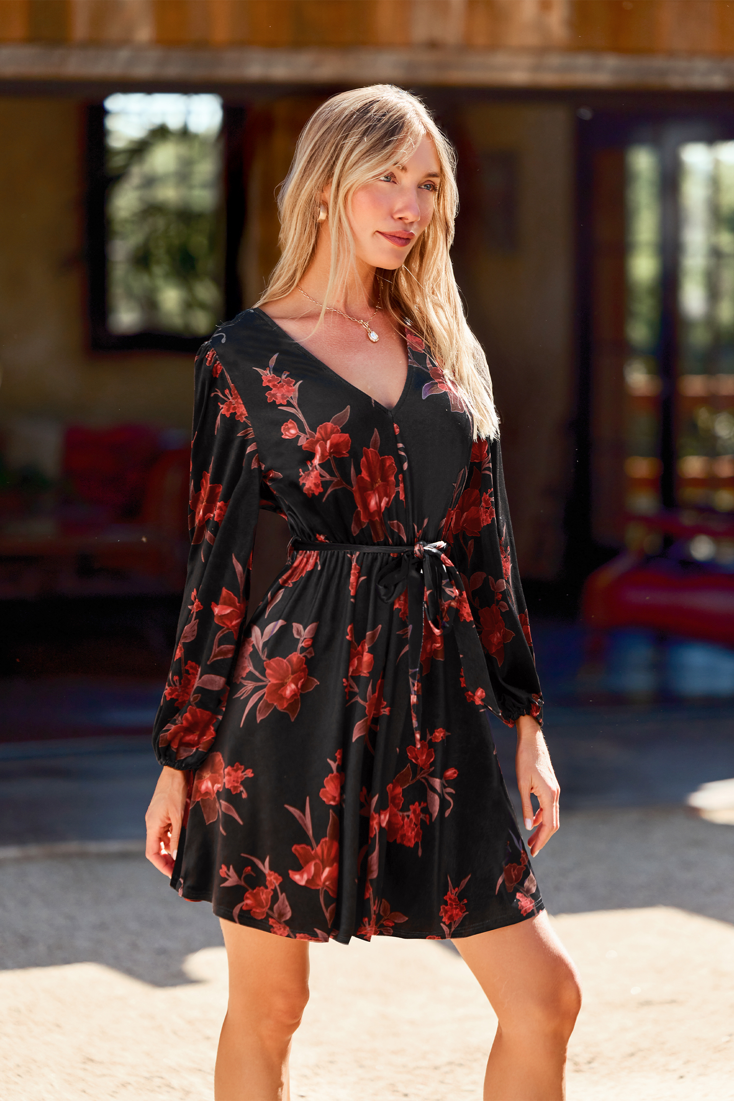 The Crimson Glory Floral Mini Dress brings all the drama in the best way! With its flirty V-neckline, flowy long sleeves, and leg-baring mini length, it’s made for your next main-character moment.