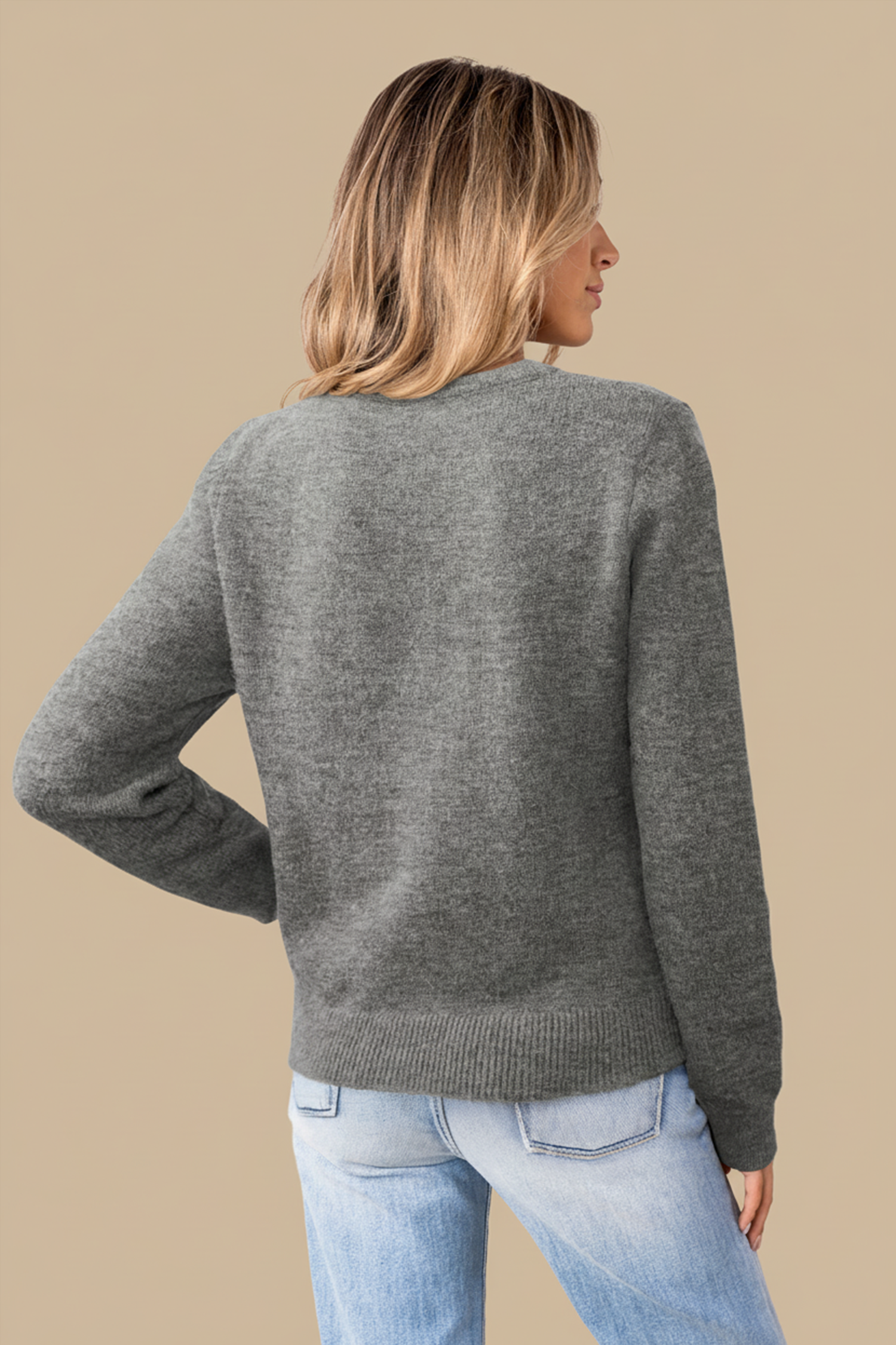 This sophisticated charcoal grey jumper features an elegant round neckline and comfortable long sleeves with distinctive decorative button detailing along the left side. Crafted from soft knitted fabric, it offers a relaxed fit with ribbed cuffs and hem for added texture. The mixed metallic button accents in gold and pearl tones create visual interest whilst maintaining timeless appeal. Perfect for casual weekend wear or smart-casual occasions, this versatile jumper pairs beautifully with jeans or tailored trousers for effortless British style.