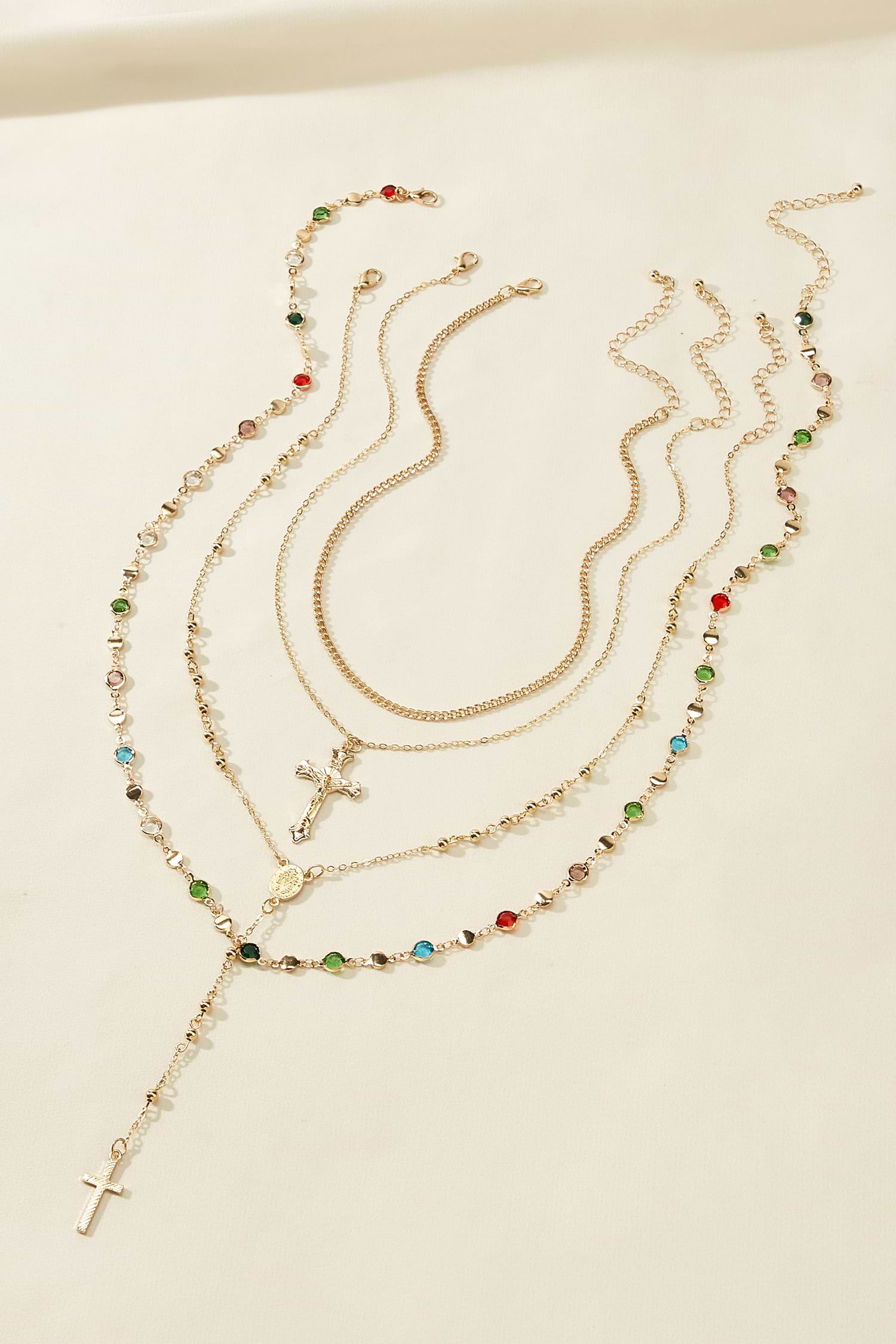 The Deity Gold-Tone Necklace Set exudes bold, elevated style! Colored stones, gold-tone chains, and a cross pendant layer together for a stunning, statement-making look.