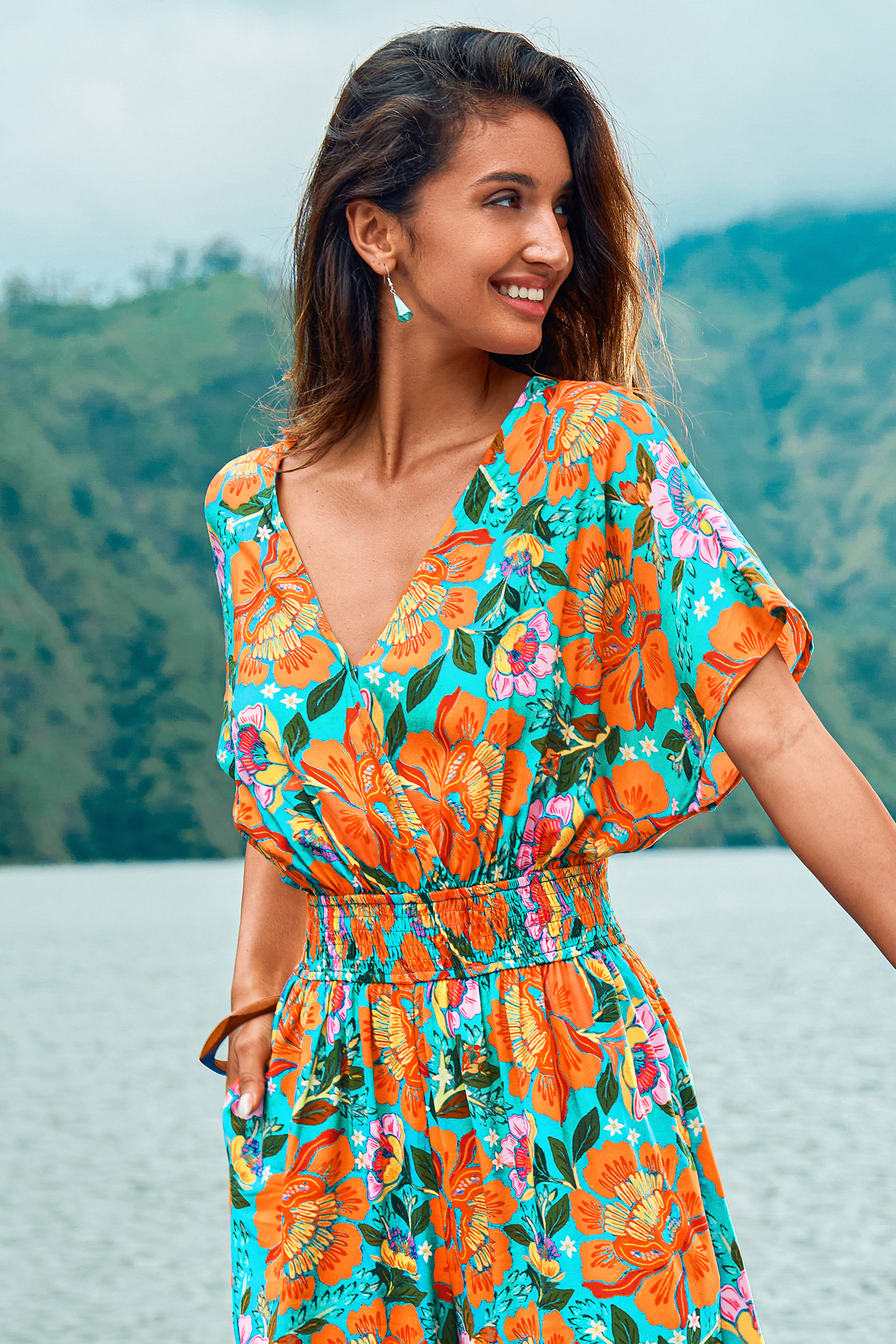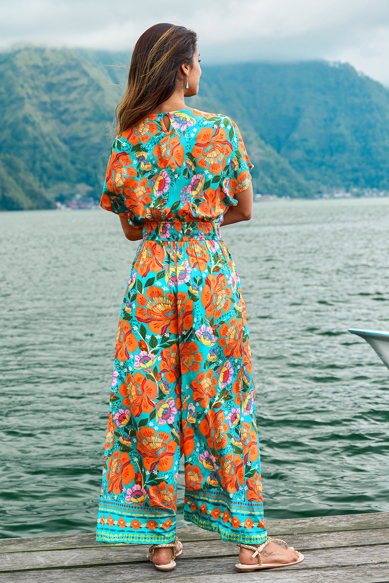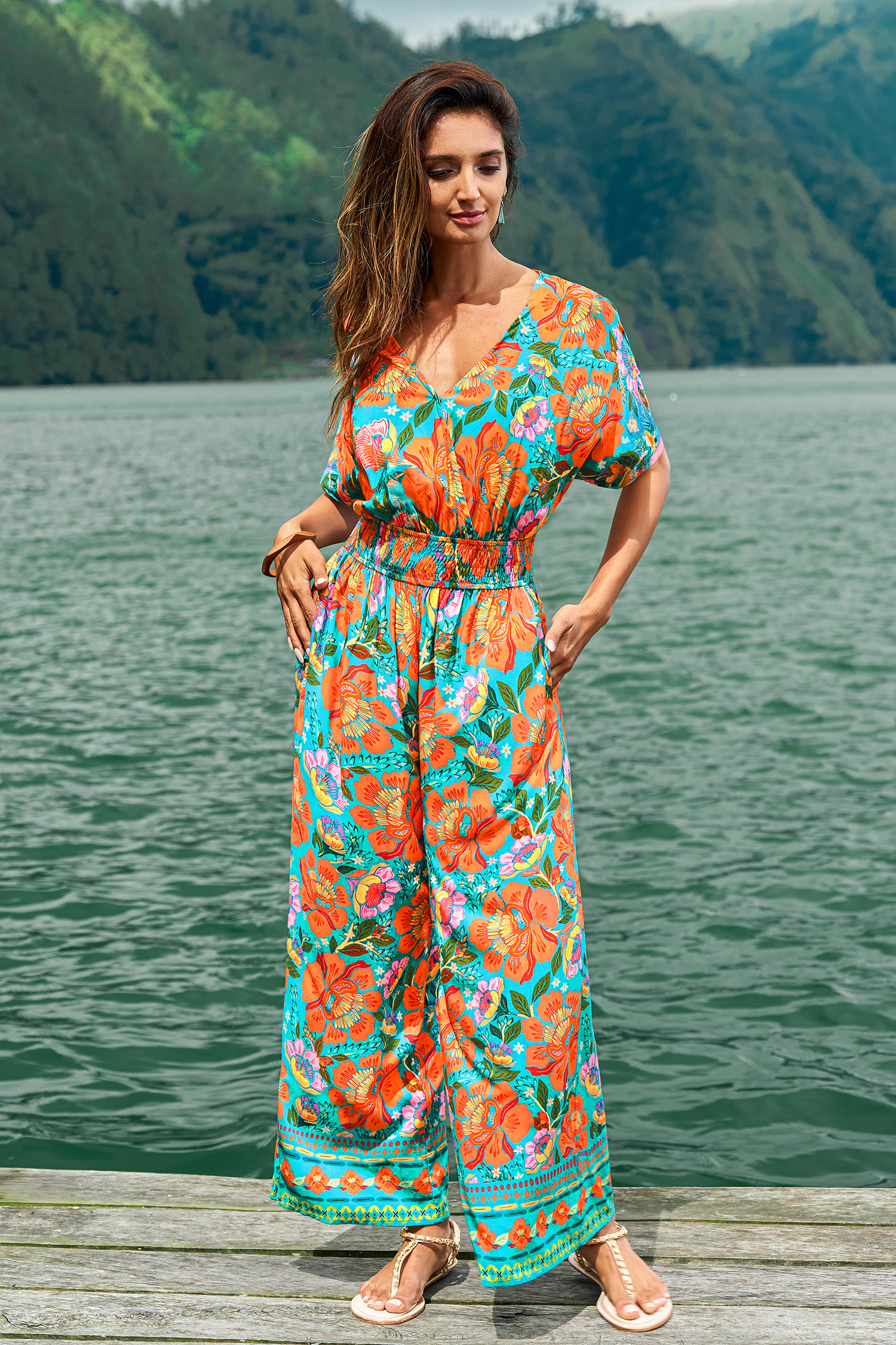 Move with ease in the Feel the Flow Floral Jumpsuit! The surplice neckline, short sleeves, and elasticized waist pair perfectly with wide legs for a relaxed, feminine fit.