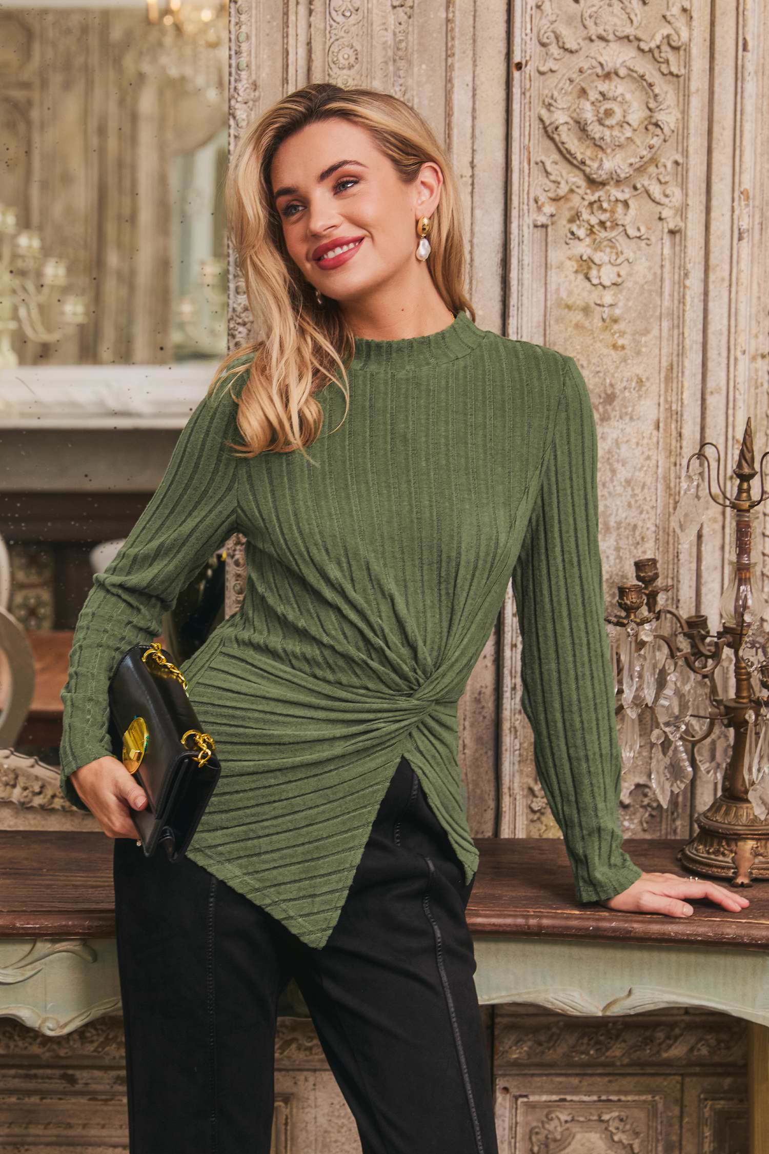 The Game Changer Green Top makes a statement without trying too hard! It features a high neckline, long sleeves, and an asymmetrical hem for a fresh, modern vibe.