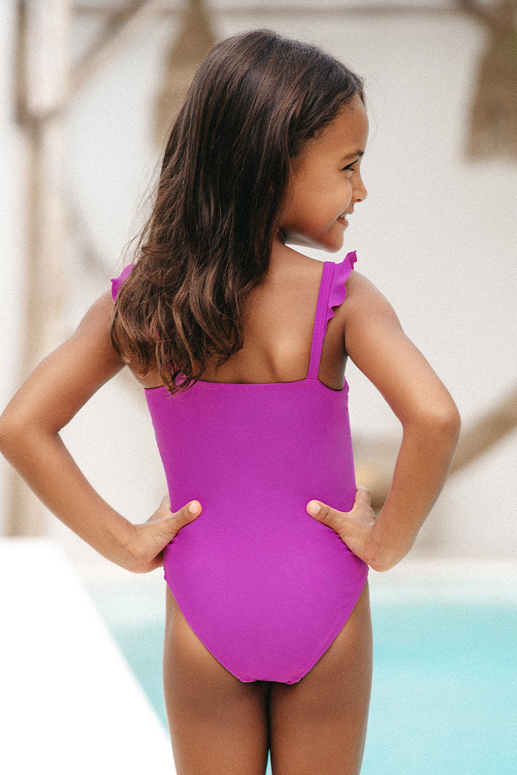 Girls Purple Solid Smocked Ruffled One Piece Swimsuit