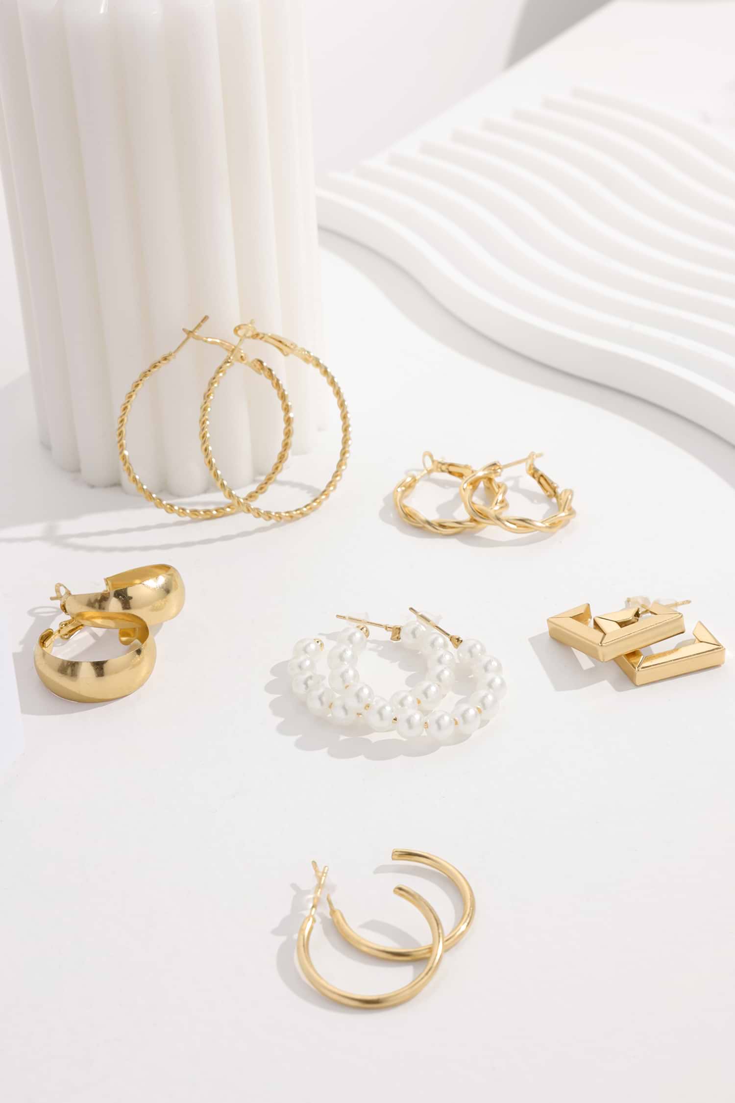 The Glow Together Gold-Tone Earring Set brings a chic, playful edge to any look! This set features hoops in varied sizes and shapes with faux pearl accents for a versatile finish.