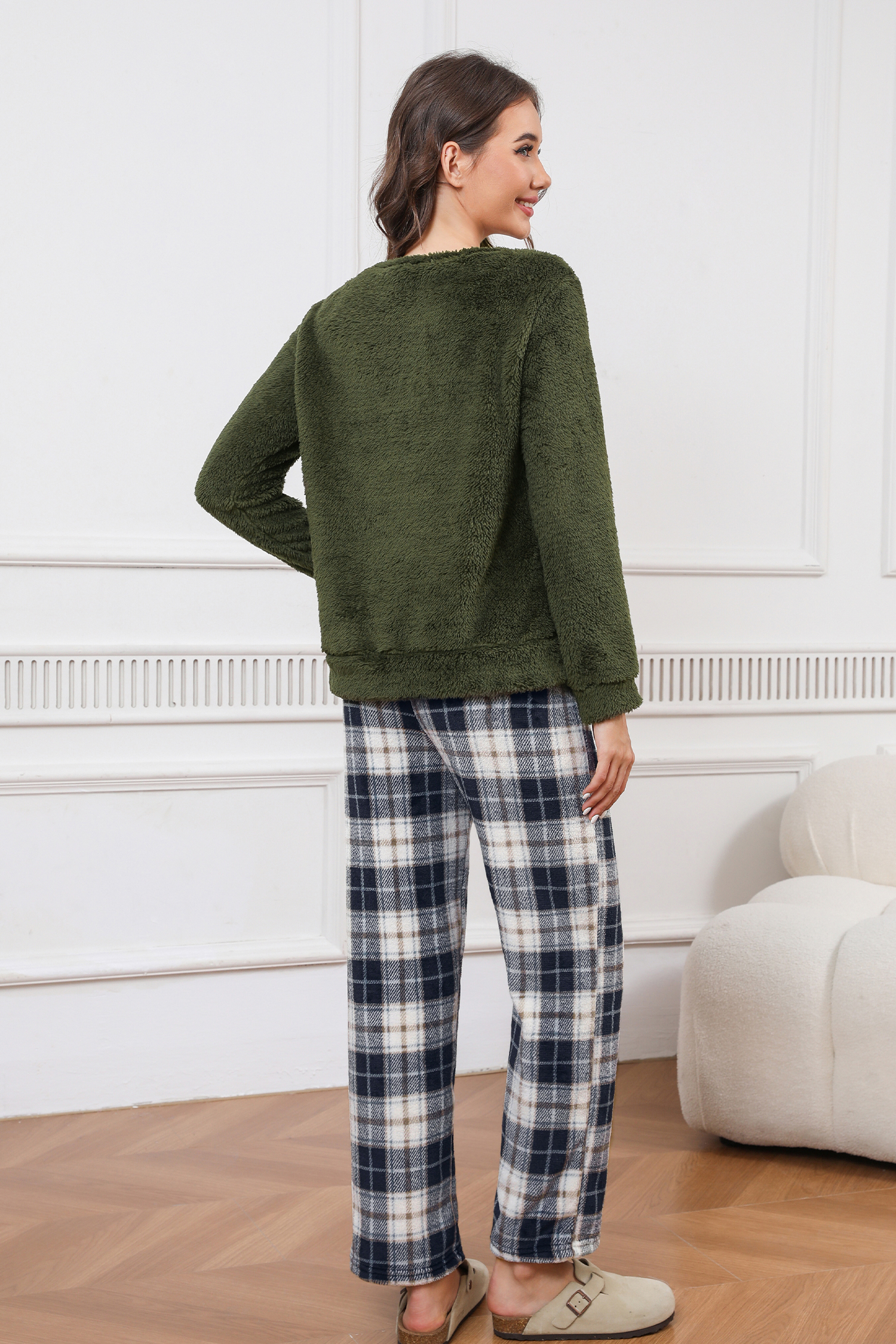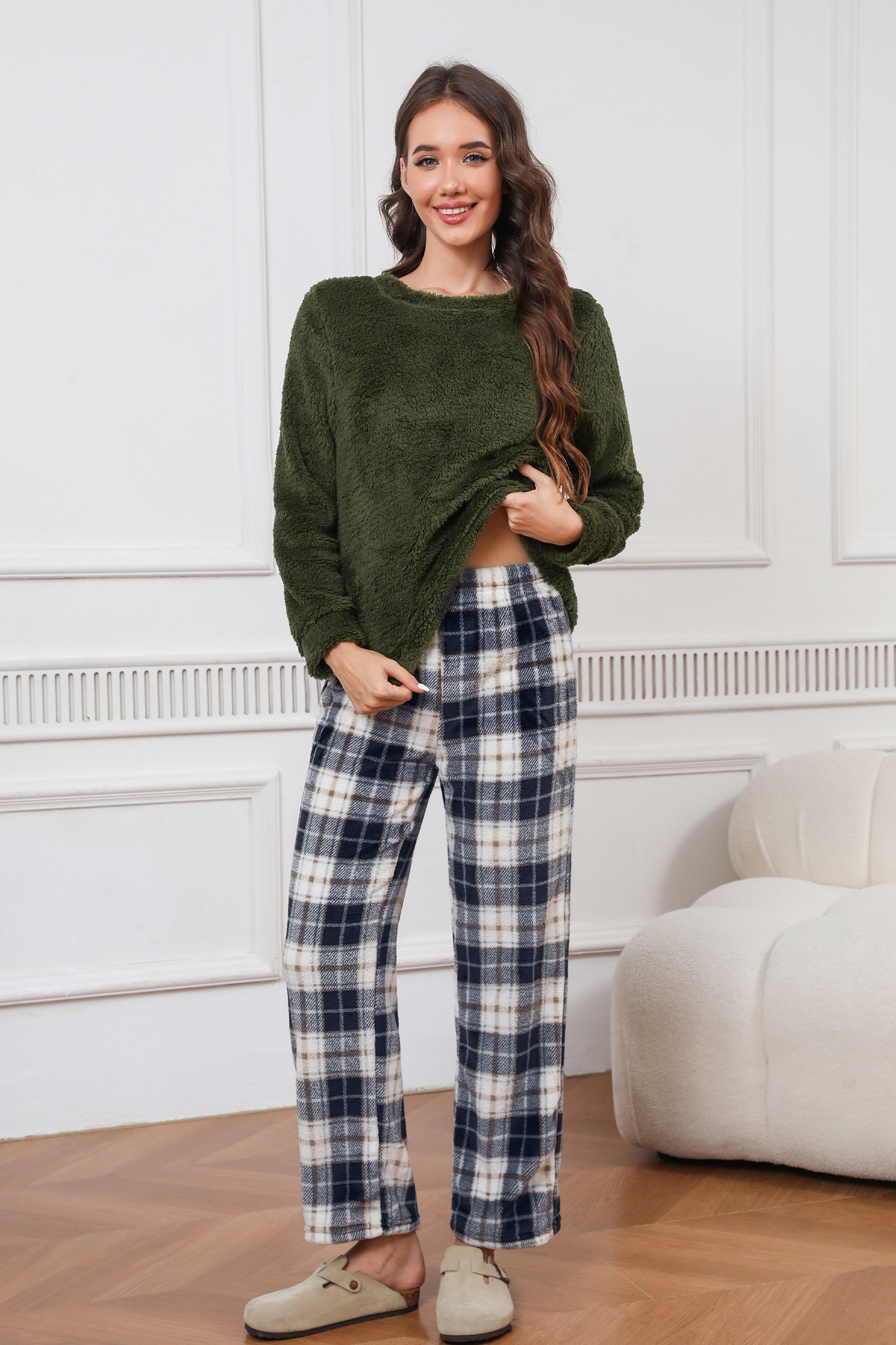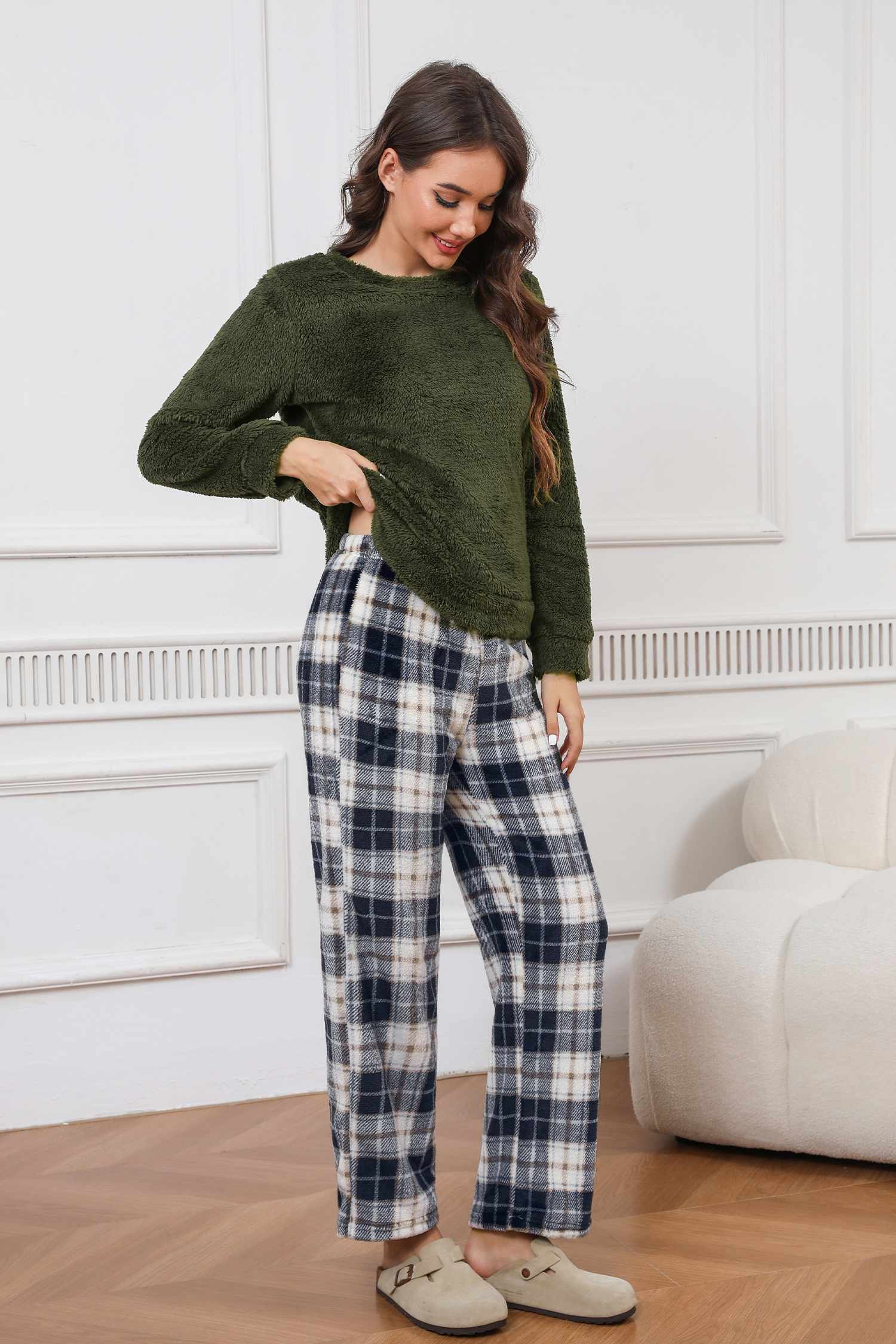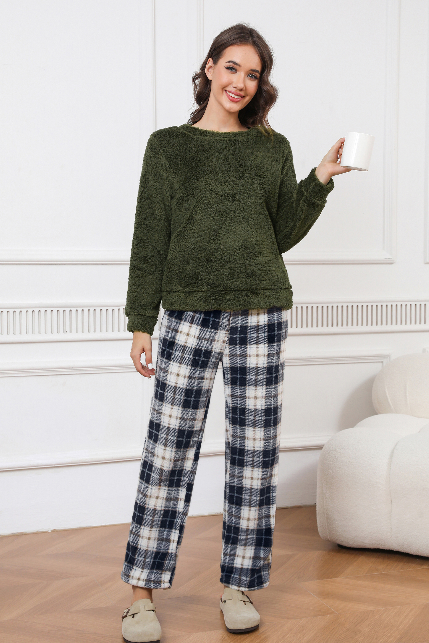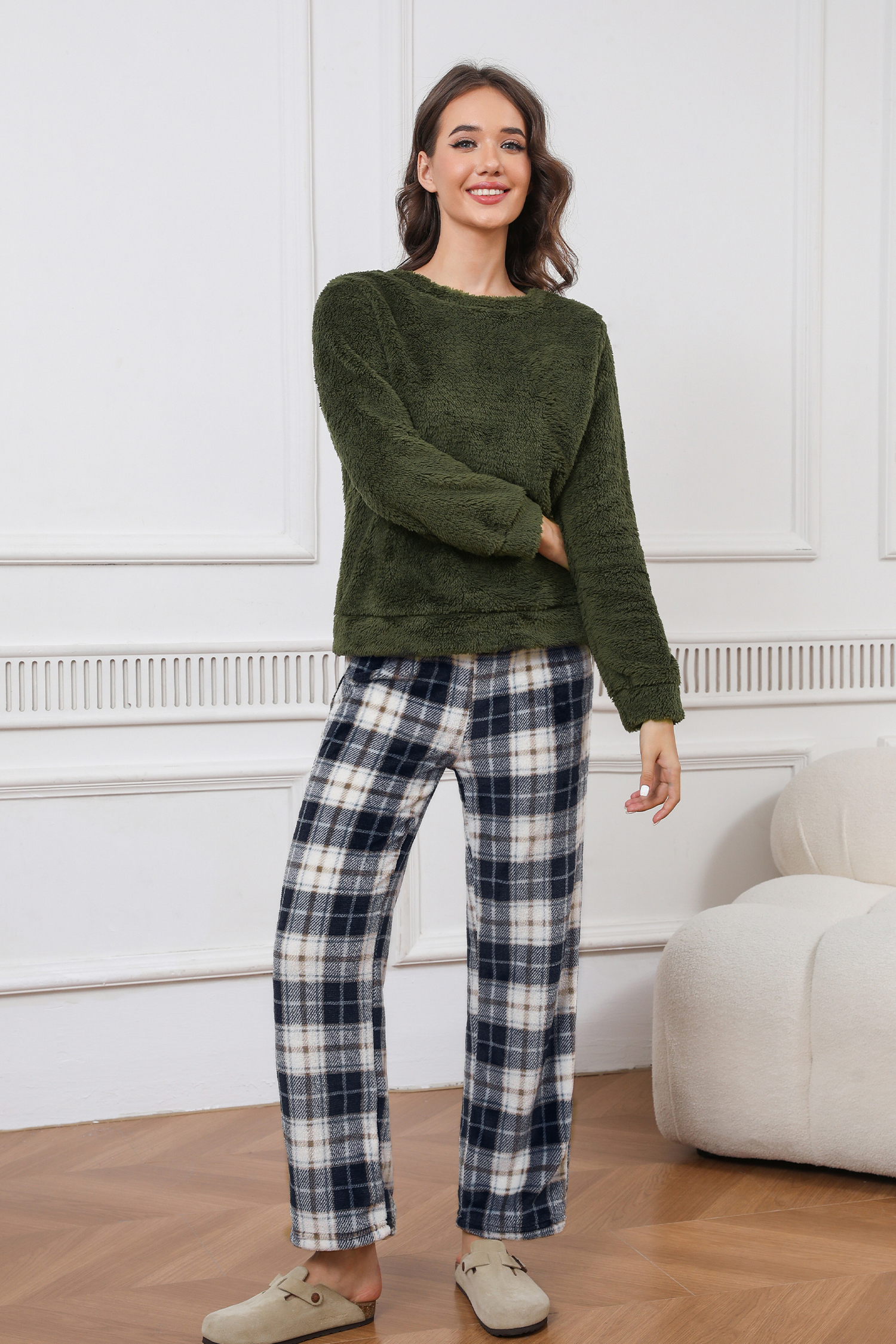 HomeGreen Fuzzy Kintted Jumper & Plaid Pants Pajama Set