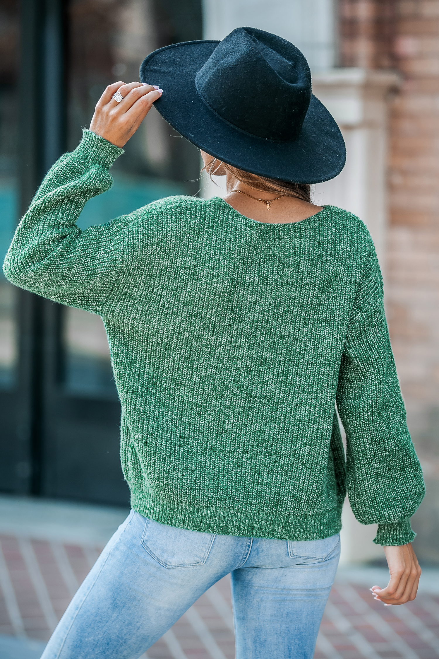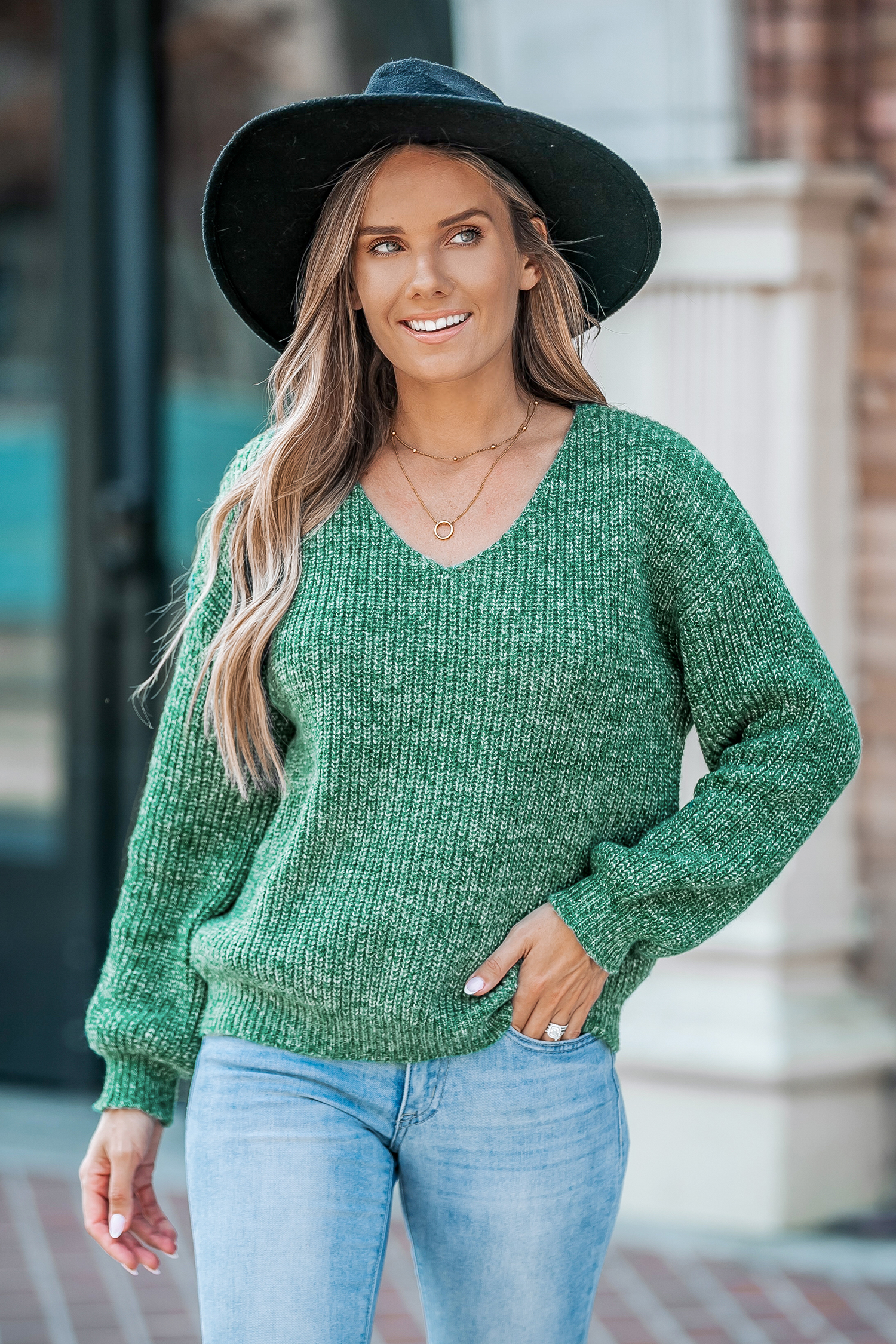The Green V-Neck Drop Shoulder Long Sleeve Sweater combines a laid-back vibe with a flattering v-neck and relaxed drop shoulders. It's the perfect mix of casual cool and effortless style.