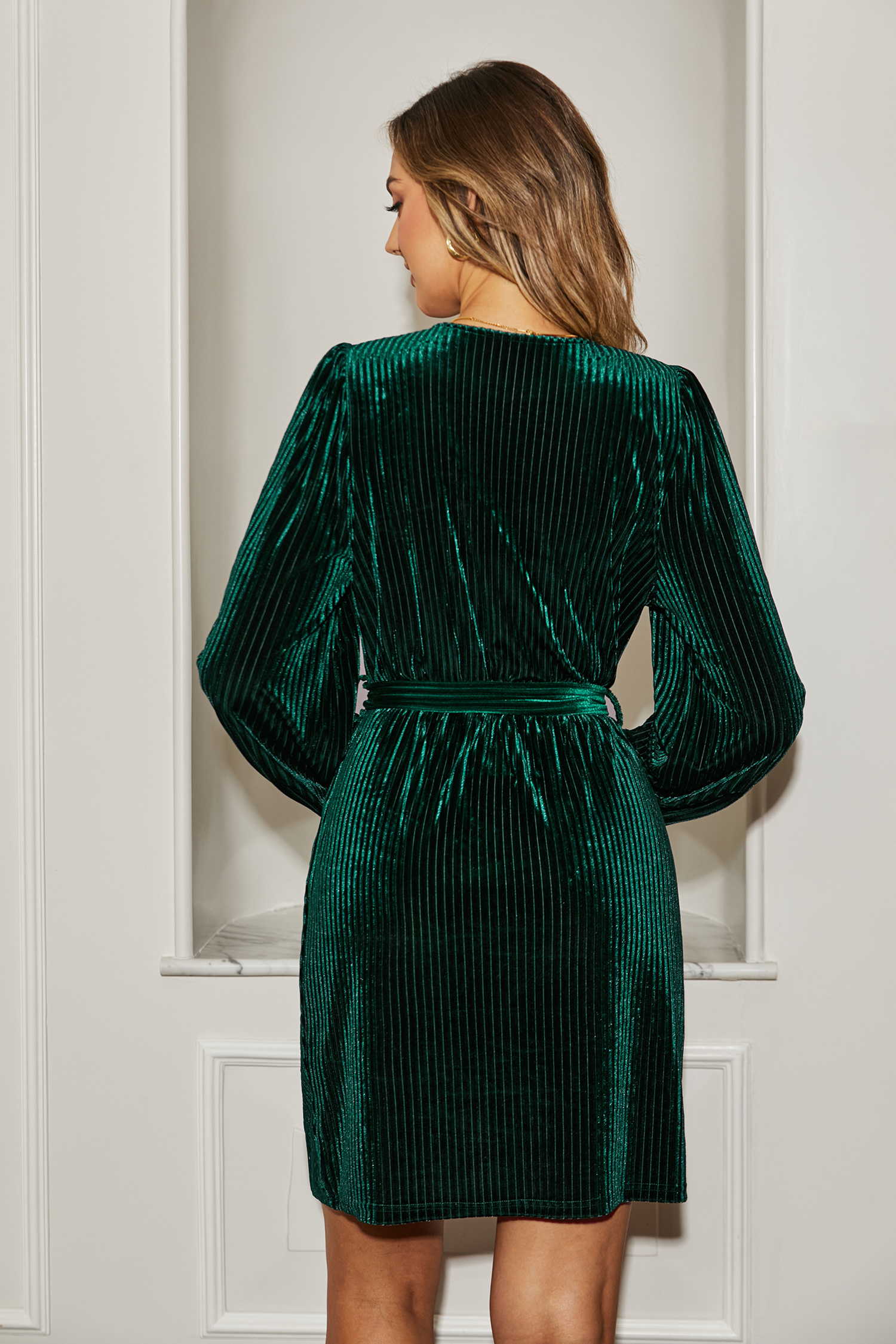 This glamorous emerald velvet dress features luxurious pleated texture and an elegant wrap design. The long sleeves and tie waist create a beautifully flattering silhouette, whilst the rich velvet fabric adds sophisticated glamour. Perfect for parties, celebrations, and special occasions where you want to make a stunning impression.