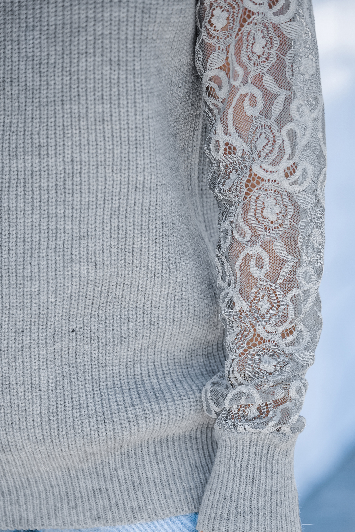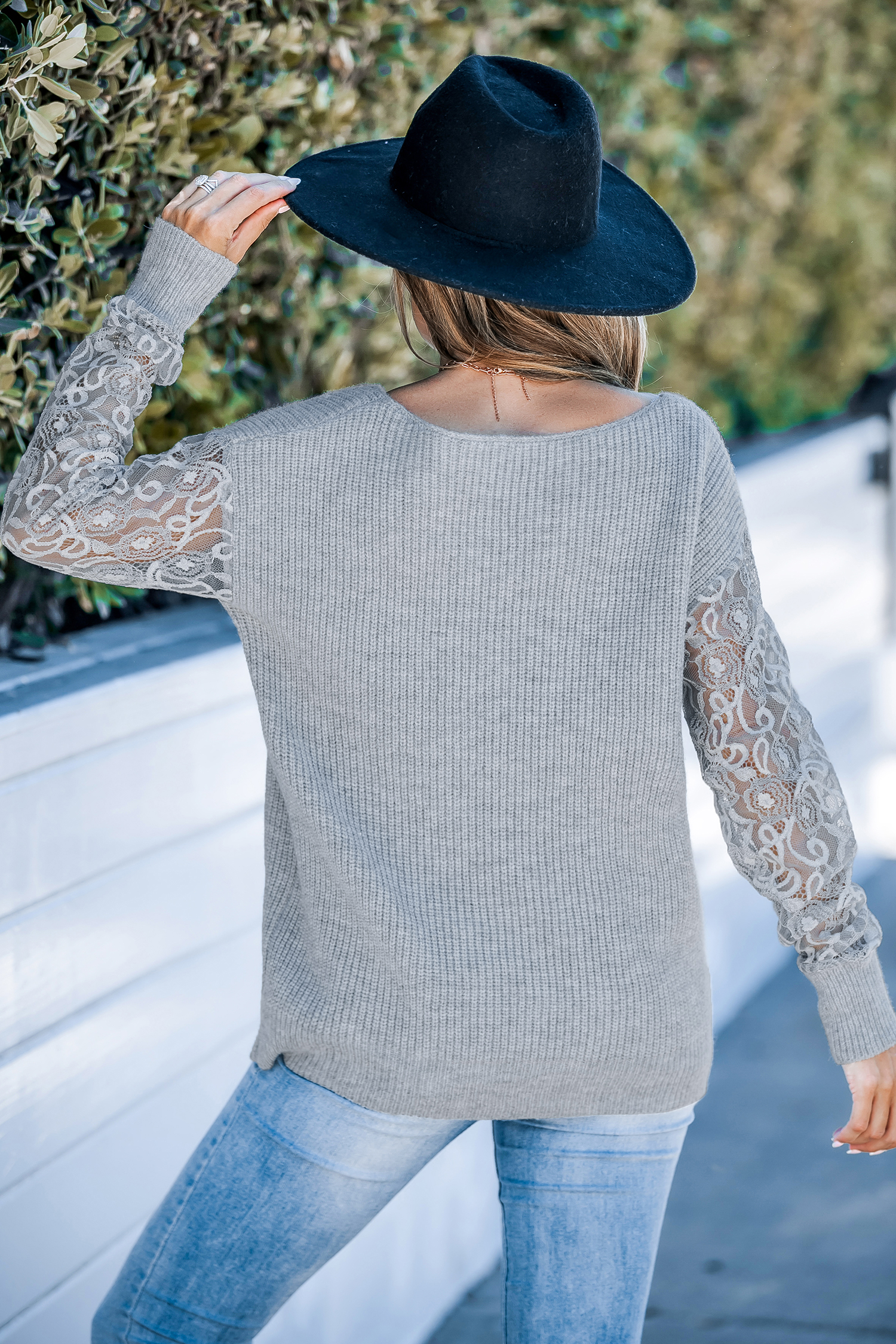 Grey Floral Lace Sleeve Rib V-Neck Jumper