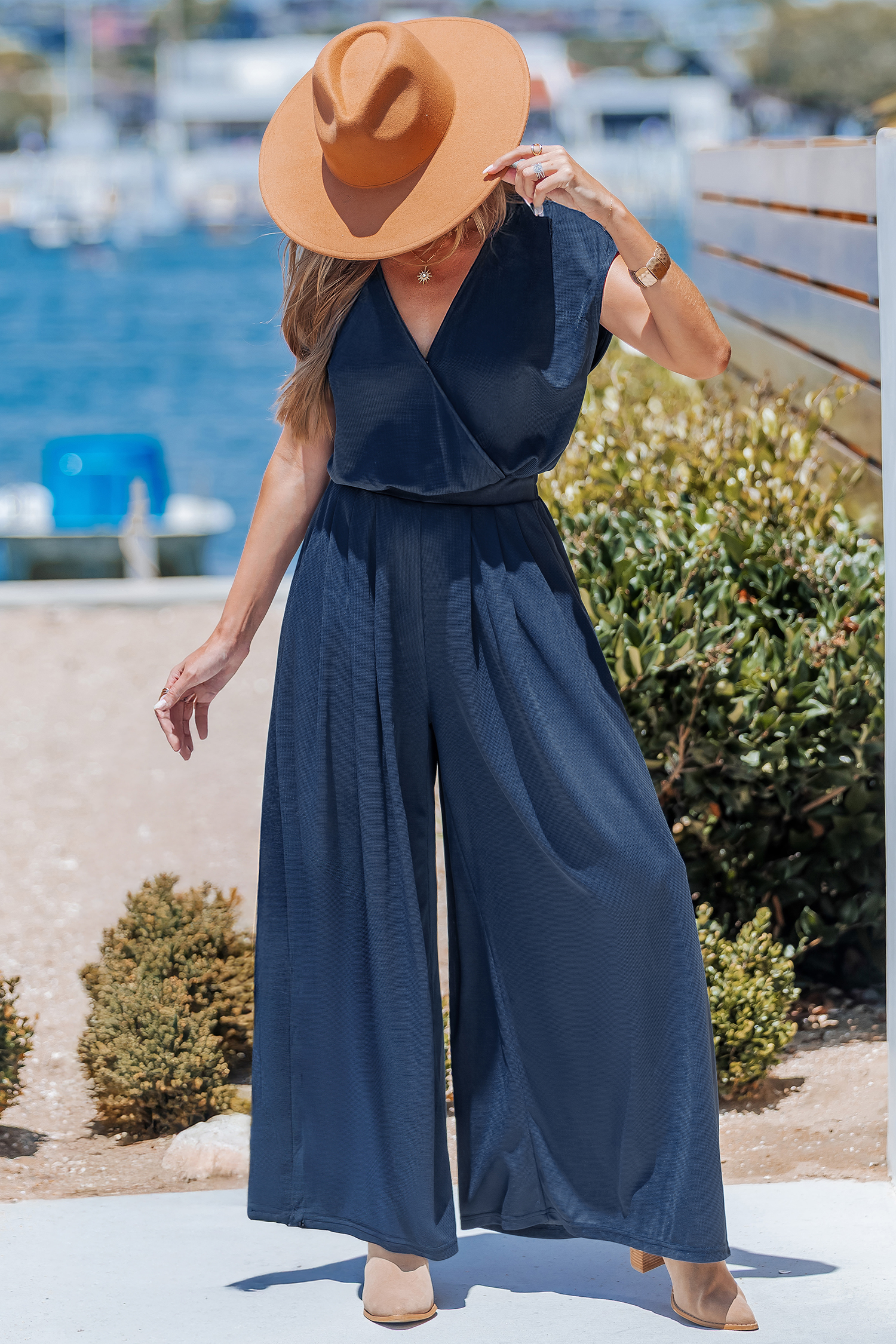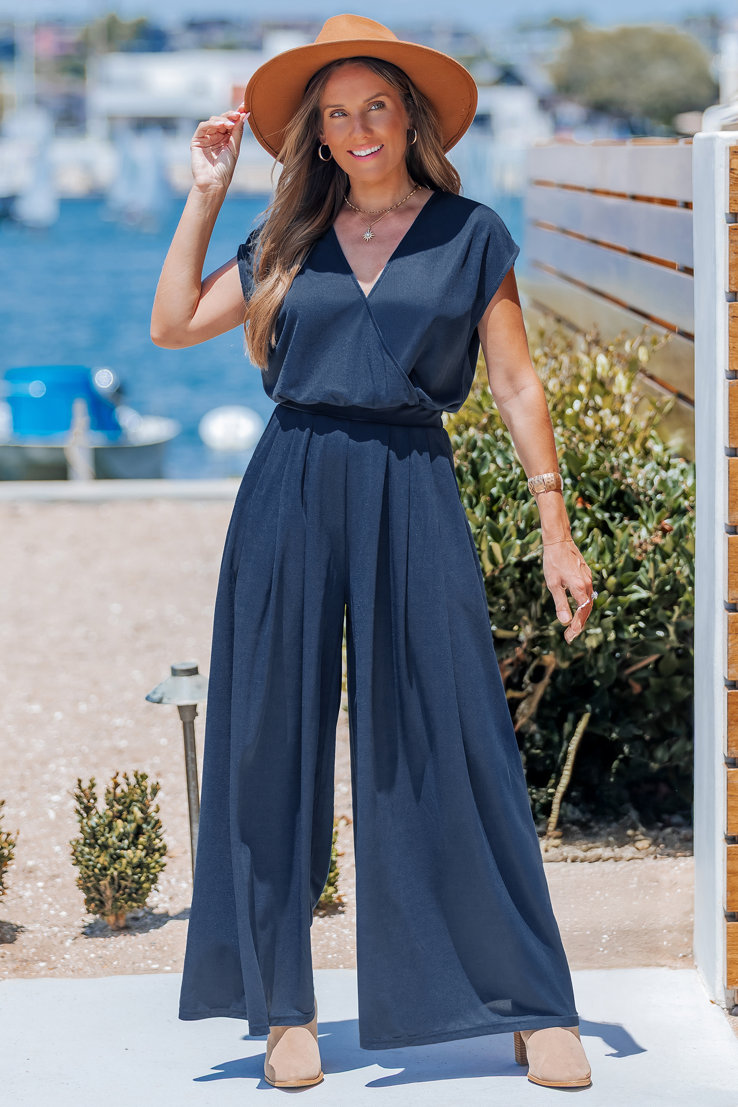 The In Her Element Blue Jumpsuit is the perfect piece for a throw-on-and-go vibe! A surplice neckline, short sleeves, waist tie, and wide-leg silhouette bring easy structure with a soft, flowy feel.