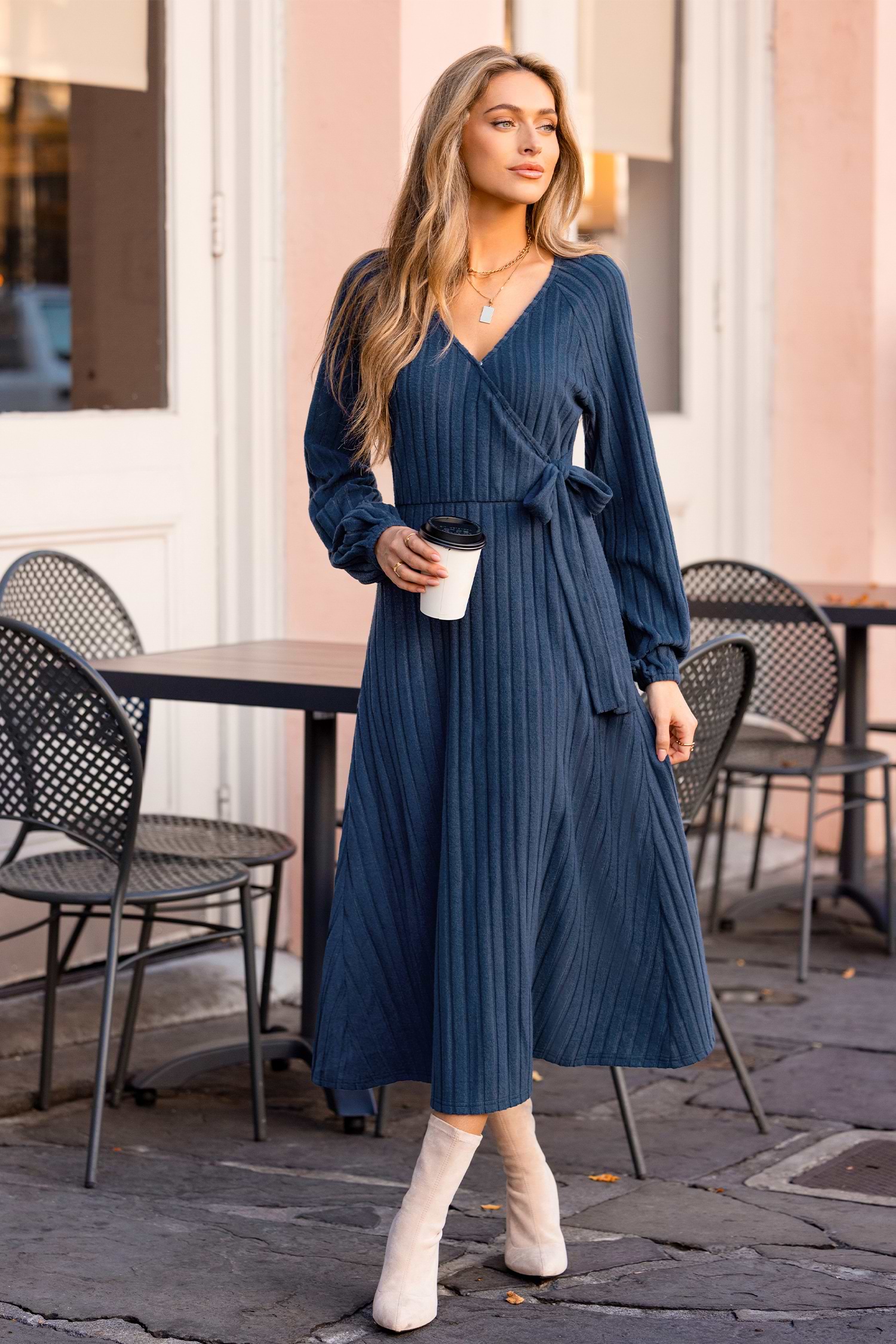 The In the Spotlight Blue Midi Dress is timelessly elegant! Featuring a surplice neckline, long sleeves, and midi length, it’s perfect for any day-to-night look.