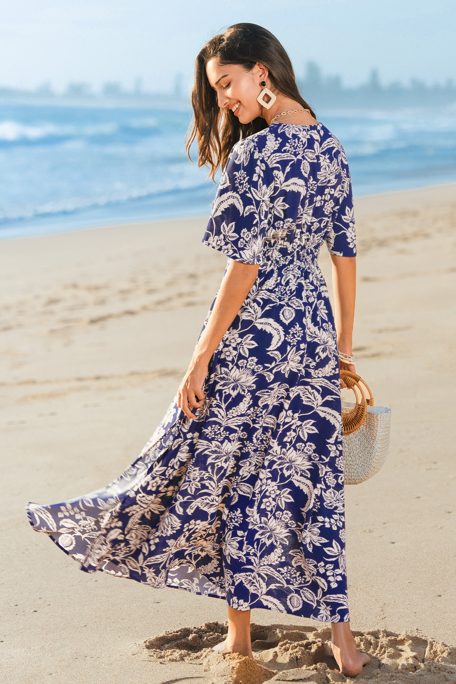 Blue Satin Twist & Keyhole Pleated Maxi Dress