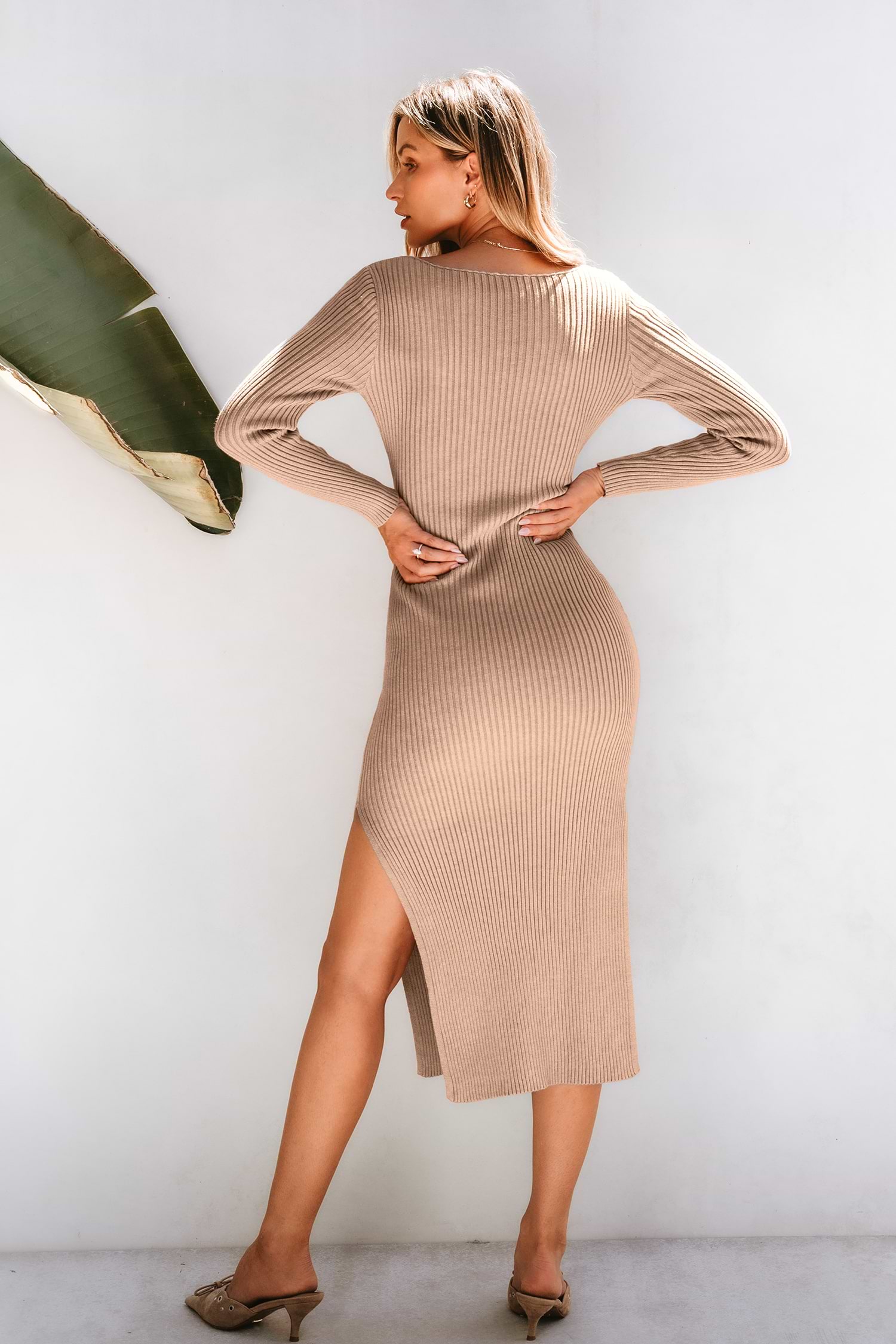 Khaki Ribbed Knit Boatneck Long Sleeve Midi Jumper Dress