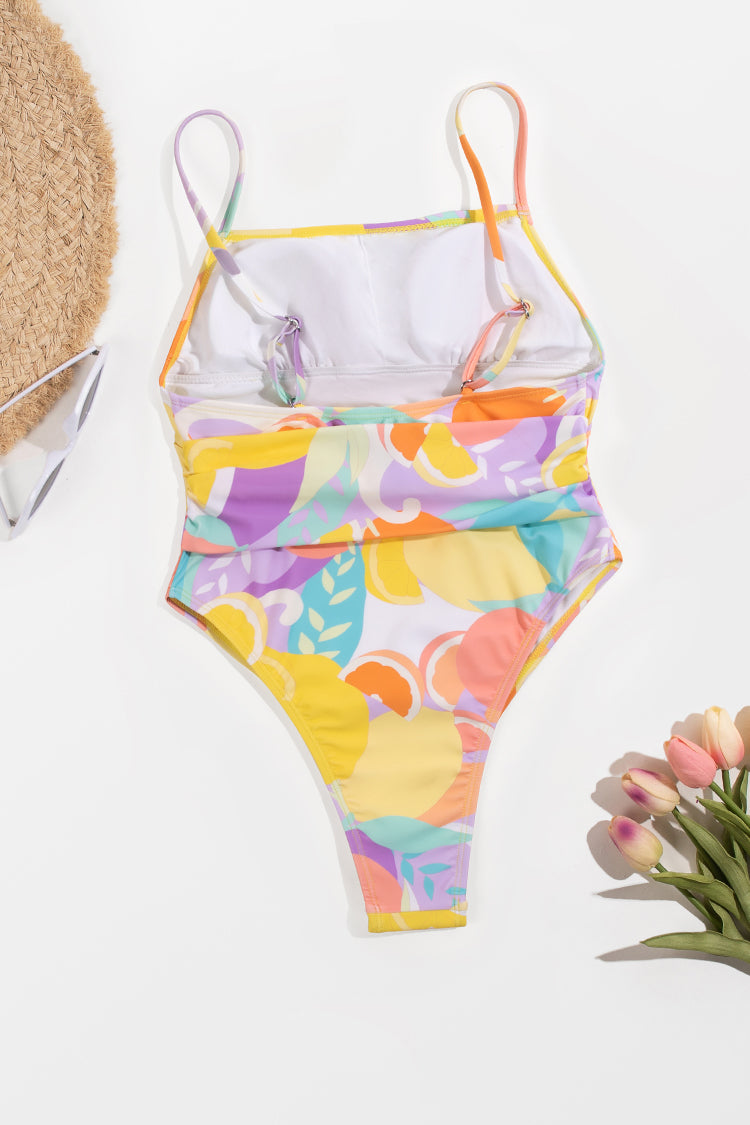 Print Belted O Ring Square Neck One Piece Swimsuit-Yellow