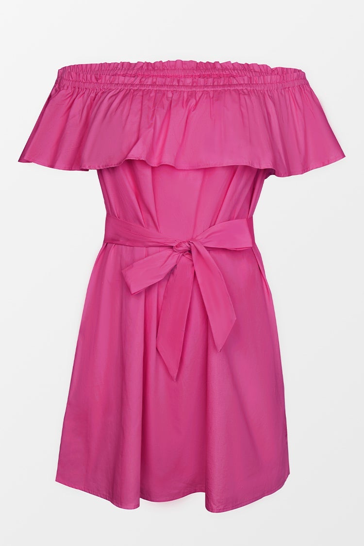 Marlene Pink Ruffle Off Shoulder Tie Waist Dress