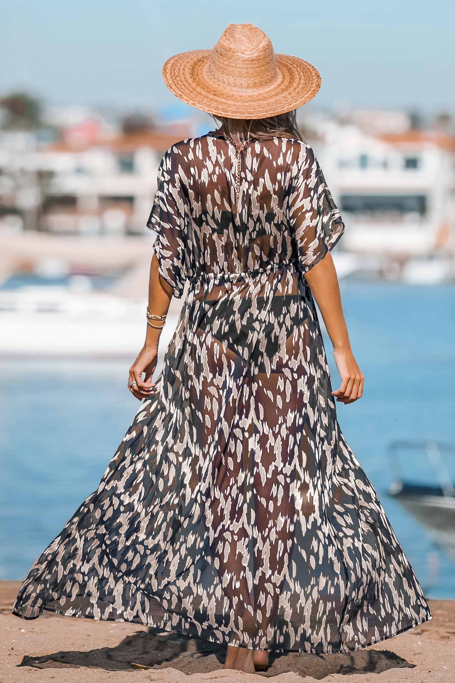 Unleash your inner animal in this swim cover-up kimono featuring a leopard print, semi-sheer construction, open-front with self-tie drawstring waist, short dolman sleeves, and a longline hem.
