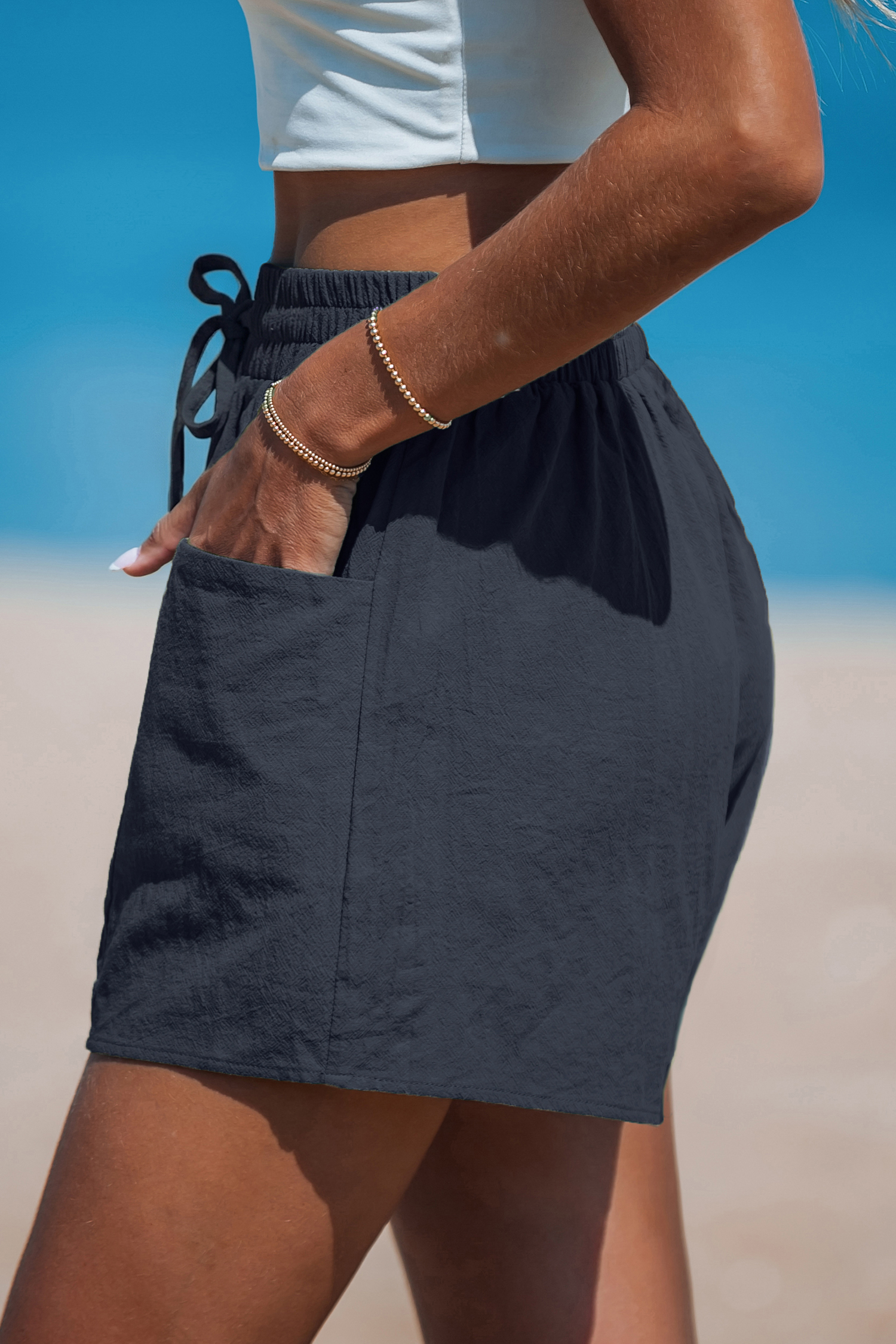 100% tightly woven cotton for breathability, durability, and a crisp finish. Expect a slightly stiff feel that softens with washing. Experience comfort and style with our Navy Elastic Waist Loose Leg Shorts. These shorts feature a flexible elastic waistband for the perfect fit and a loose leg design for ultimate ease. Ideal for relaxed days or active outings, their deep navy color makes them a versatile staple in any wardrobe.