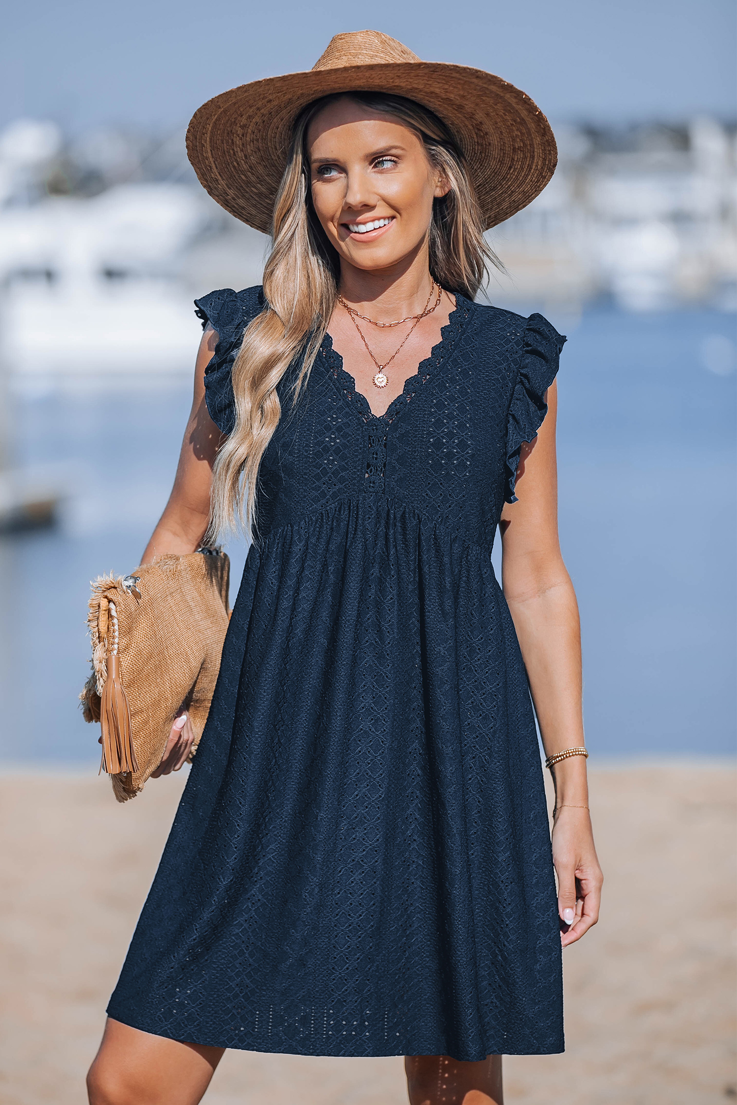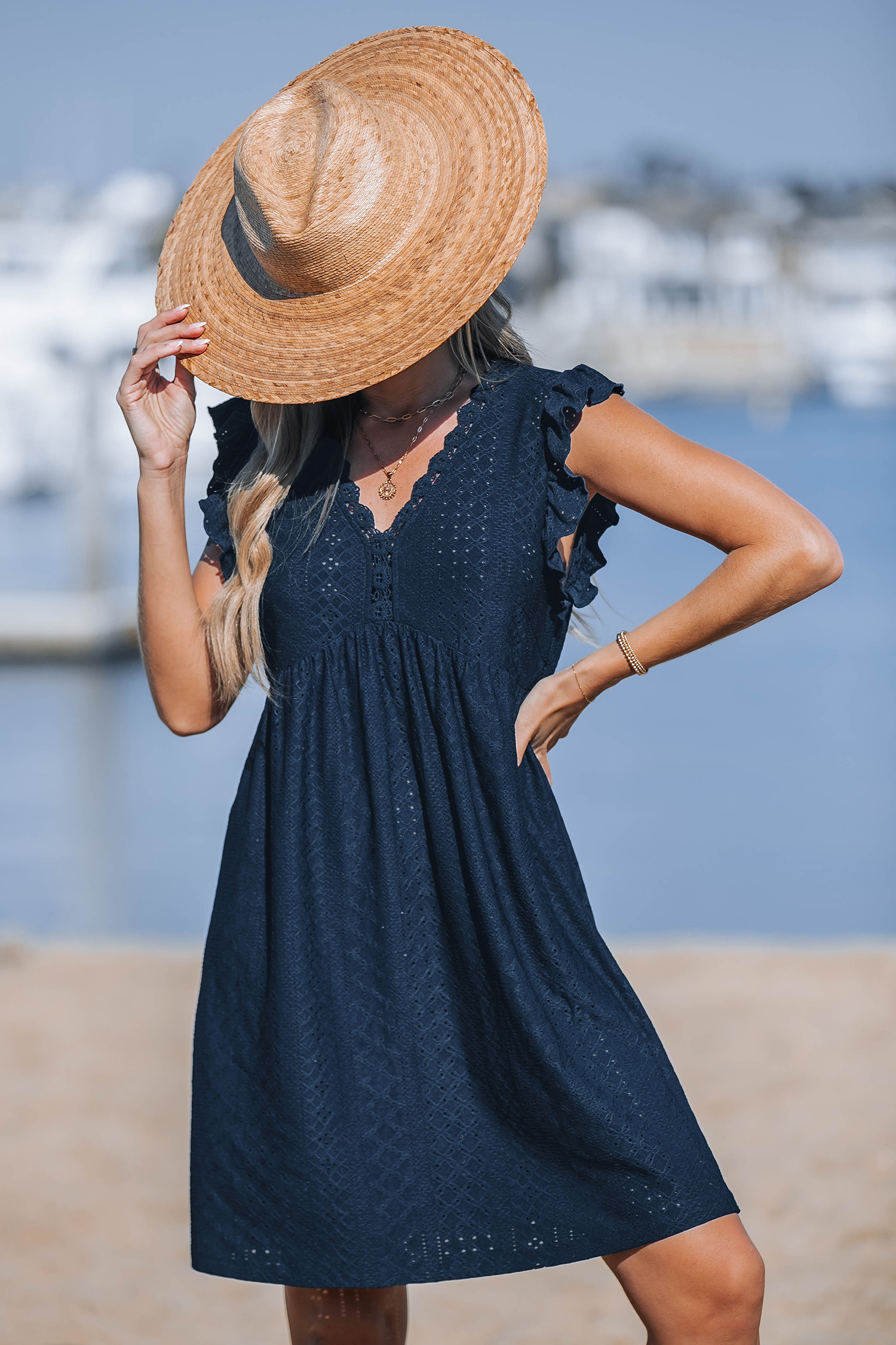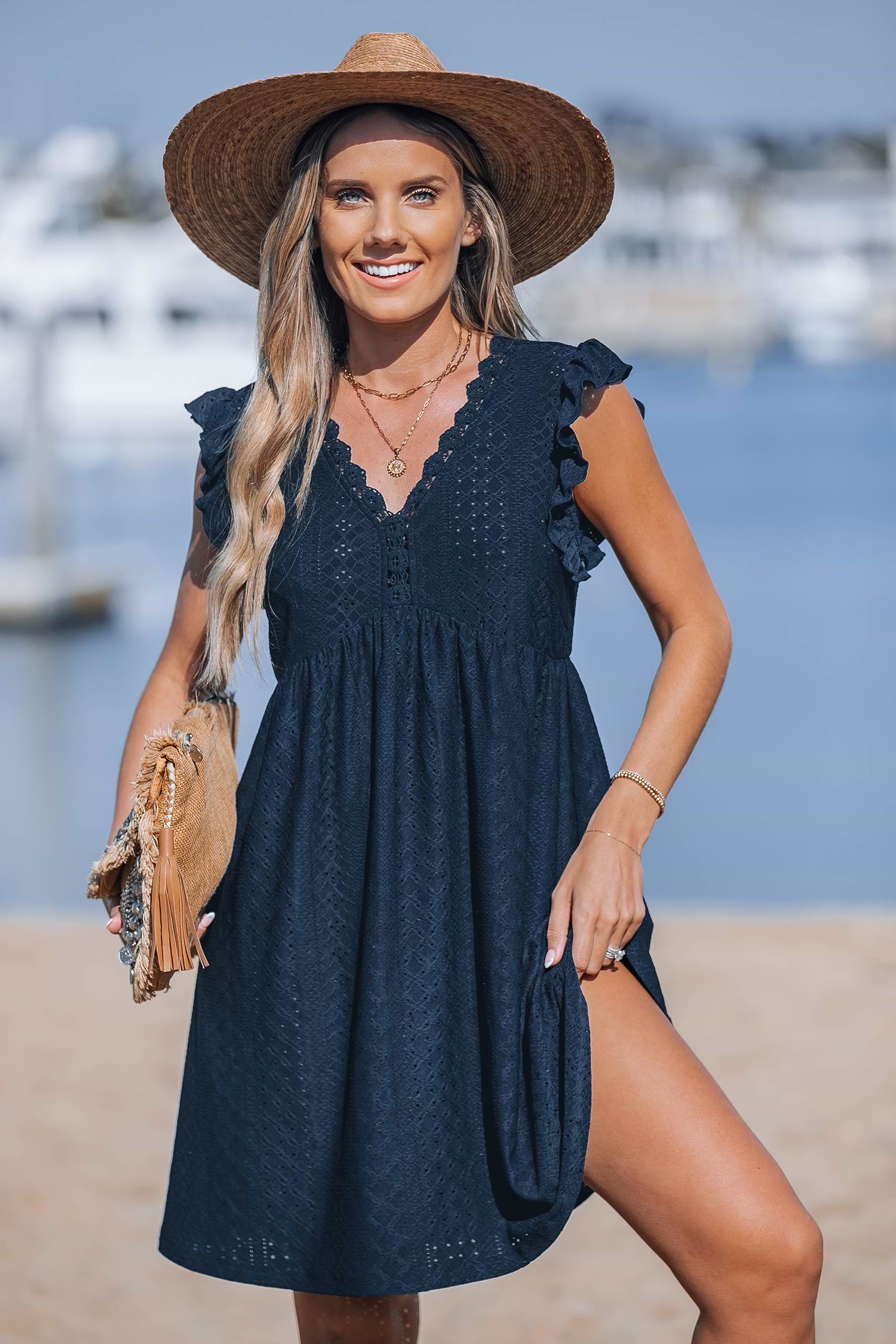 The Navy Flutter Sleeve V-Neck Mini Cover-up Dress combines a flirty V-neck with flutter sleeves for that effortlessly cool vibe. It’s your new go-to for when you want to keep it cute without trying too hard.