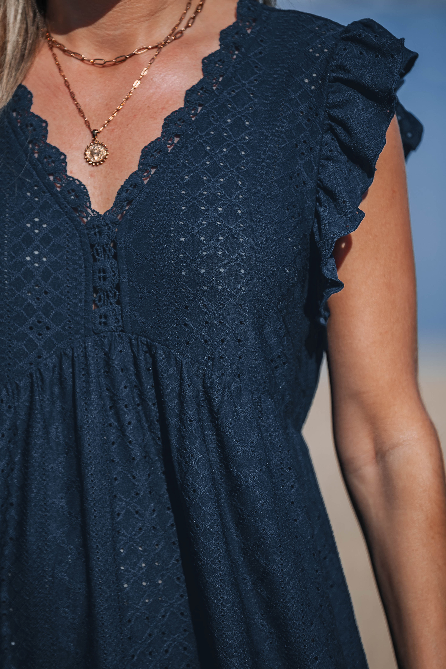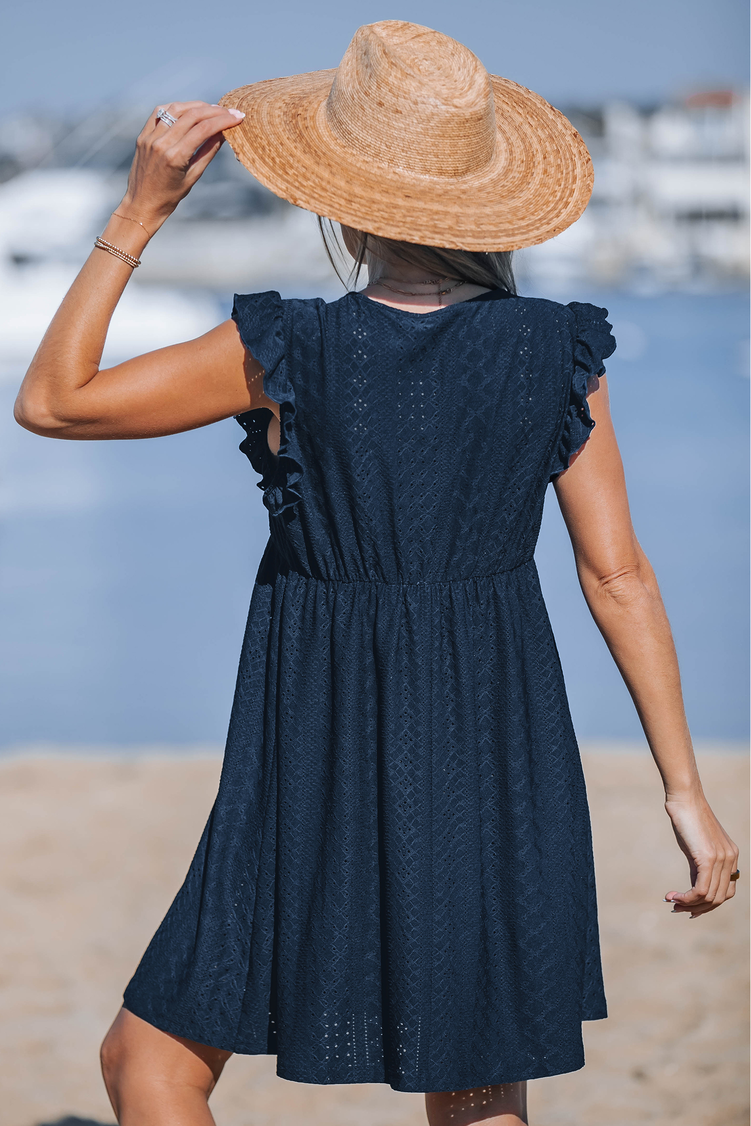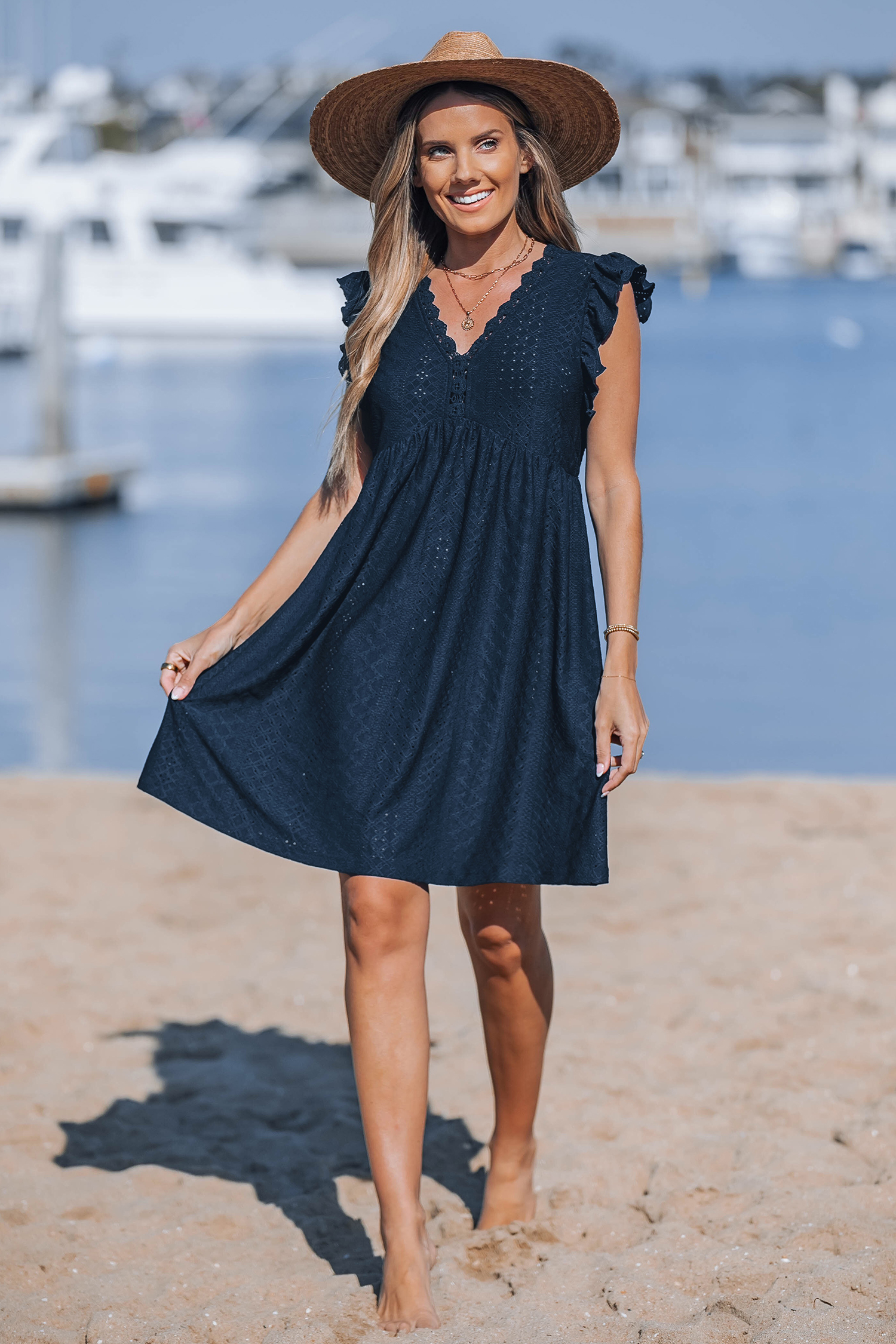 The Navy Flutter Sleeve V-Neck Mini Cover-up Dress combines a flirty V-neck with flutter sleeves for that effortlessly cool vibe. It’s your new go-to for when you want to keep it cute without trying too hard.