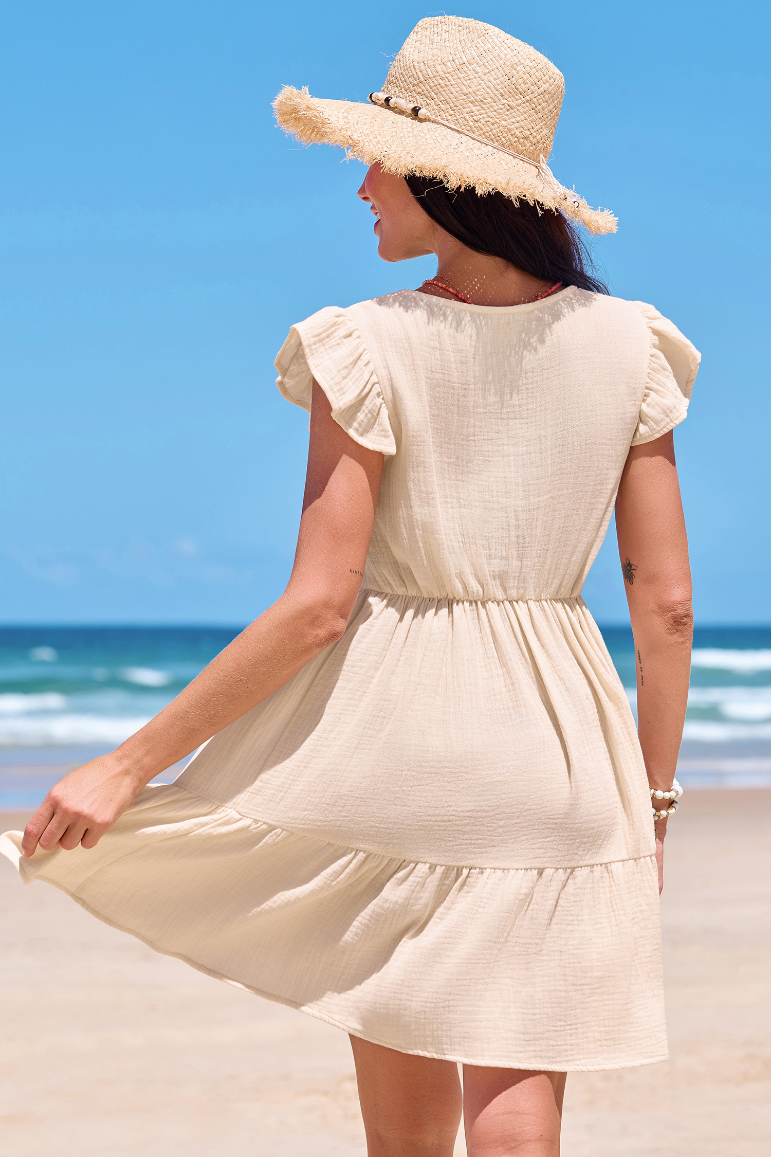The On a Picnic Beige Mini Dress is a must-have for sunny outings! With a notched neckline, contrast lace details, and a sleeveless design, this sweet mini is perfect for a picnic date.