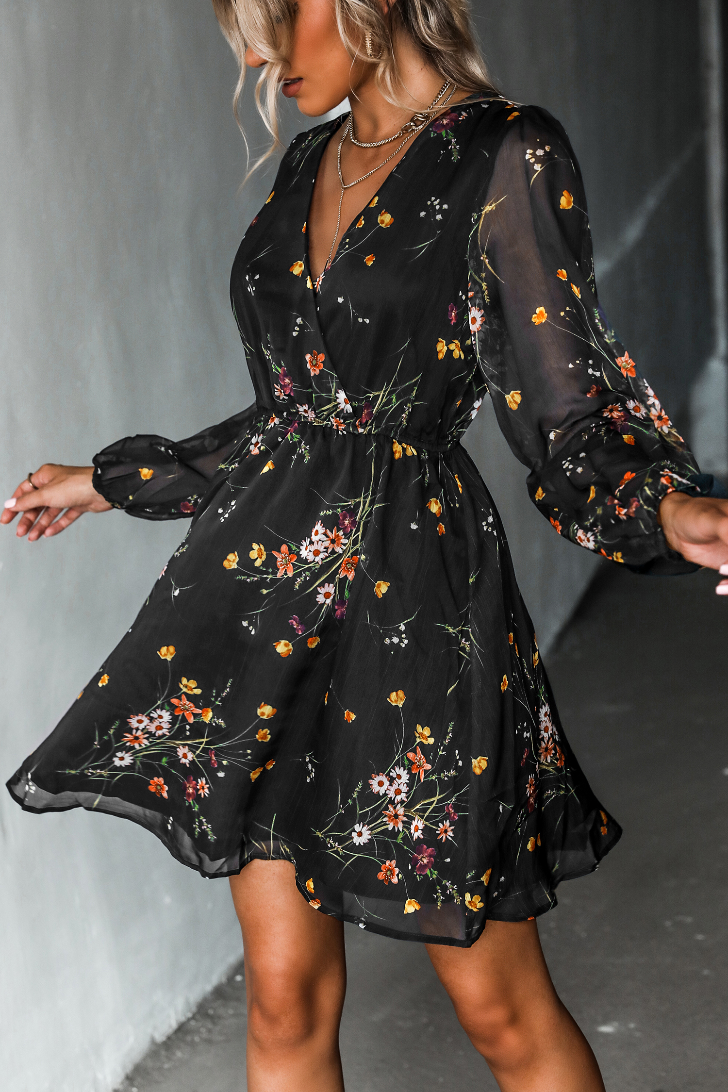 This elegant black floral dress features wrap styling and blouson sleeves. Delicate wildflower print with self-tie waist creates flattering silhouette. Perfect for casual outings and romantic occasions with bohemian flair.