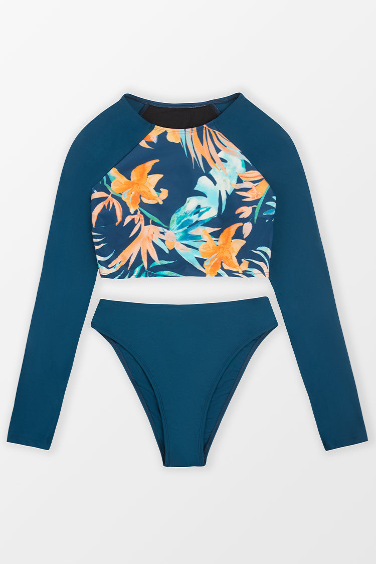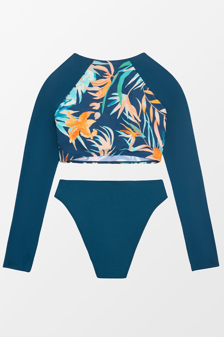 Tropical Print Rashguard Crop Top & Cheeky Bikini Set