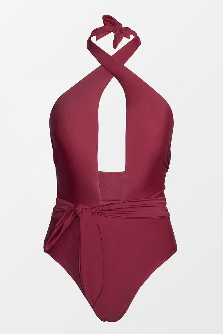 Front Cross Halter One Piece Swimsuit-Burgundy