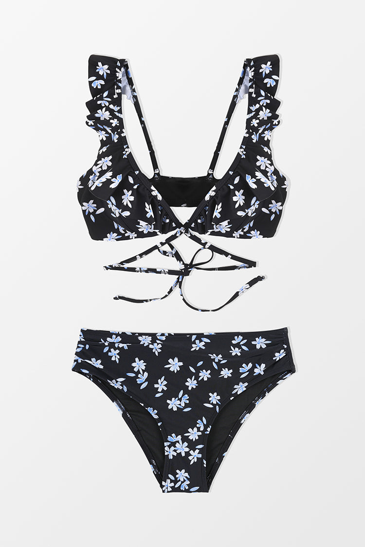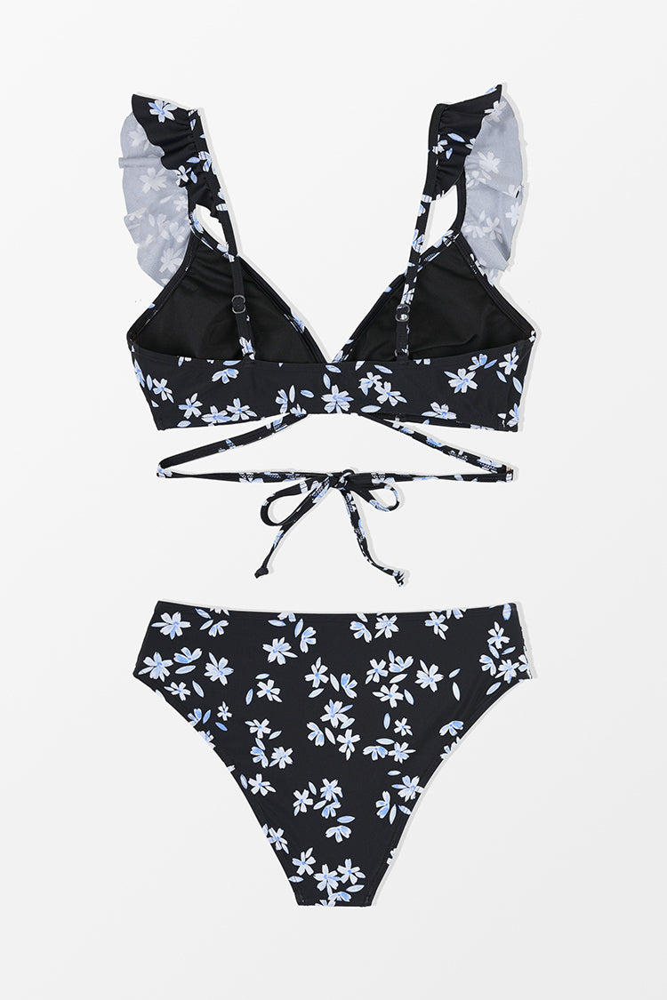 Black/White Ruffle Wrap Top & Mid Rise Bikini Swimsuit