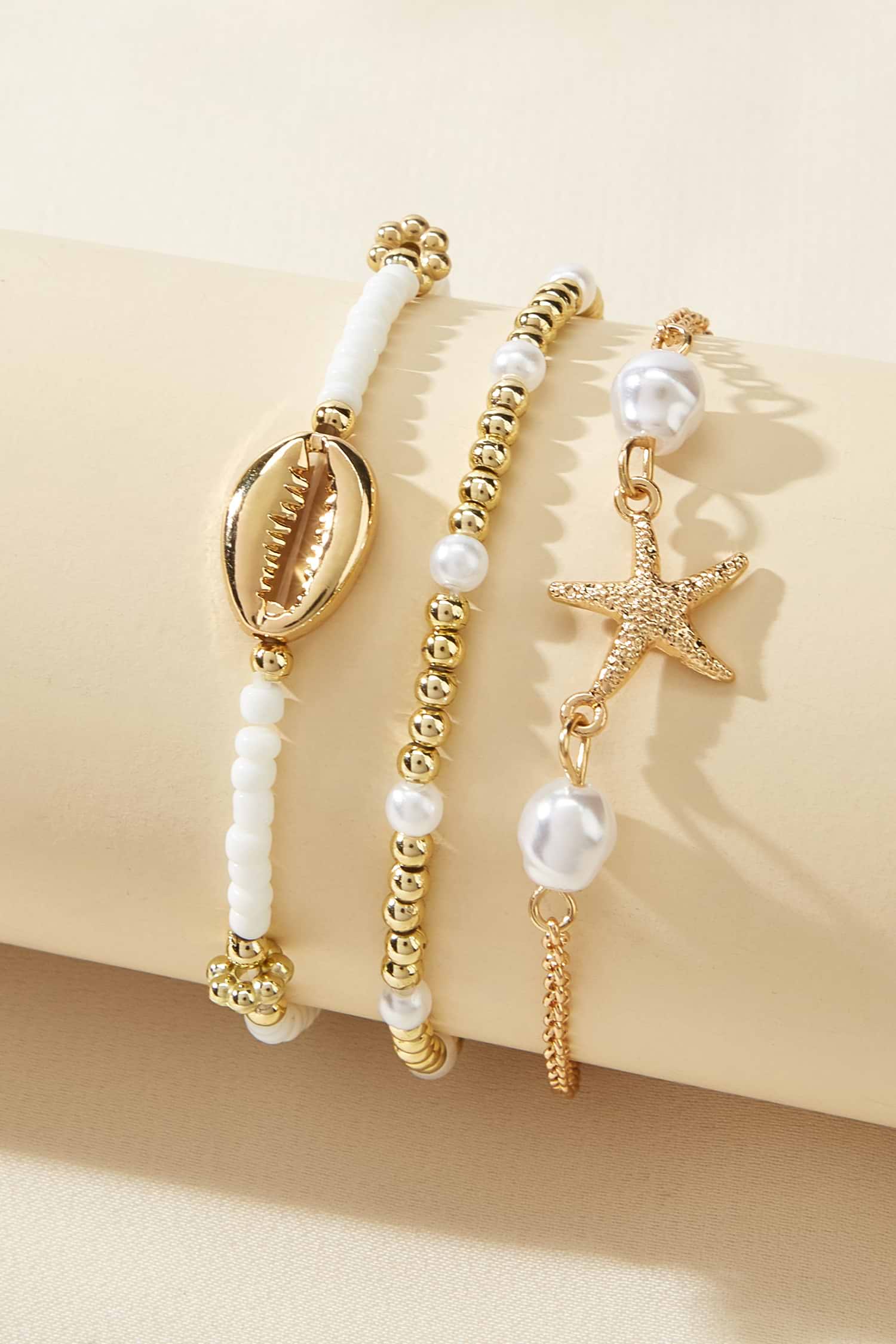 The Sea Foam Treasures Beaded Bracelet Set is all about subtle, beachy charm! Three bracelets feature beaded and gold-tone accents with delicate beach motifs for a layered, seaside-inspired look.