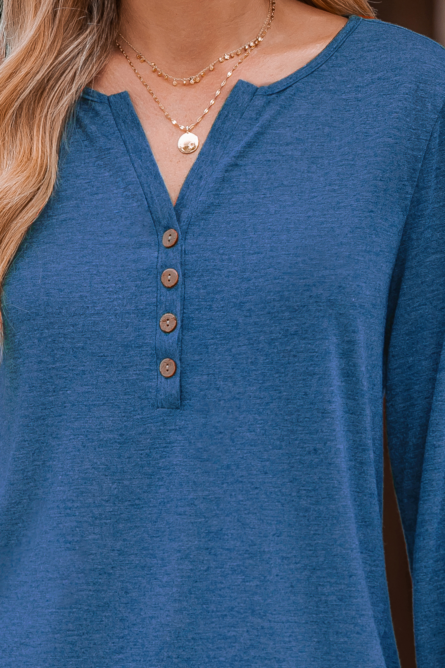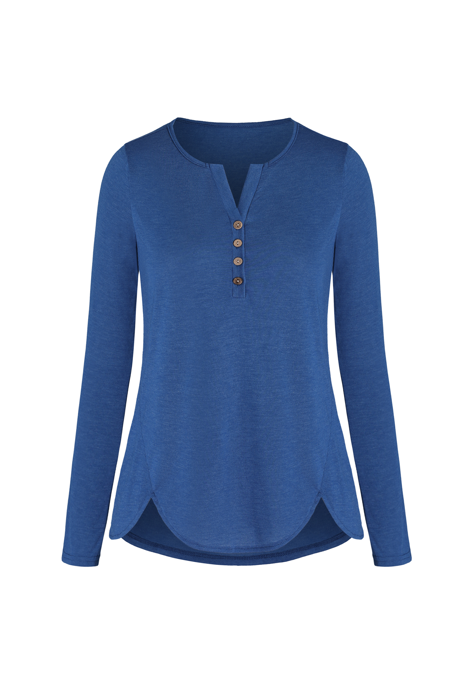 Wrap yourself in comfort and style with our Slub Knit Long Sleeve Blue Henley Tee! With its cozy slub knit fabric, scalloped hem, and classic henley neckline, this tee is the perfect blend of casual and chic, making it a versatile and essential piece for your everyday wardrobe.