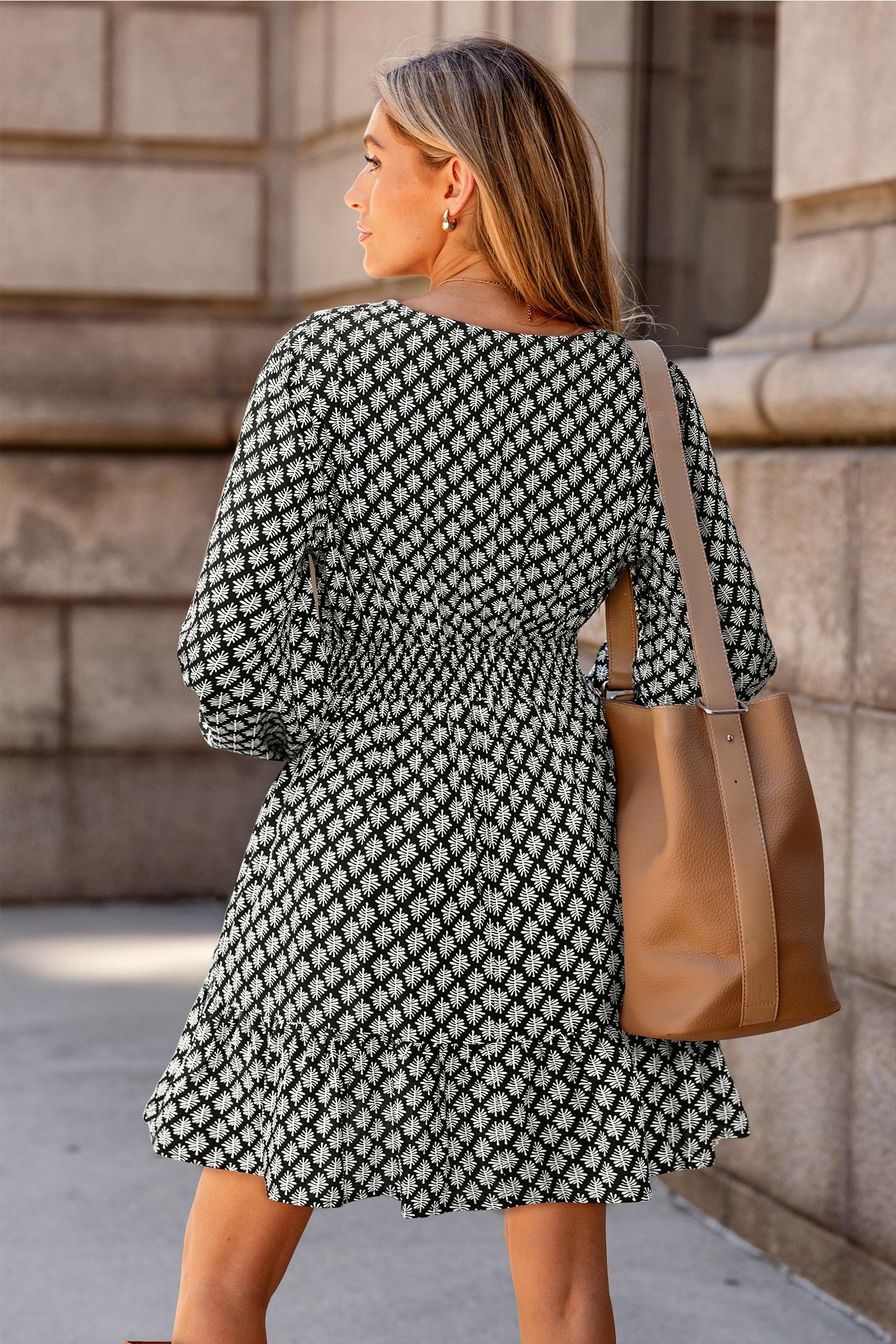 The Solstice Ornate Mini Dress combines playful charm with refined style! The V-neckline, long sleeves, smocked bodice, and mini length create a flirty, effortless silhouette.