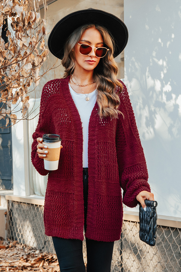 Burgundy Fluffy Knit Bow Button Cardigan