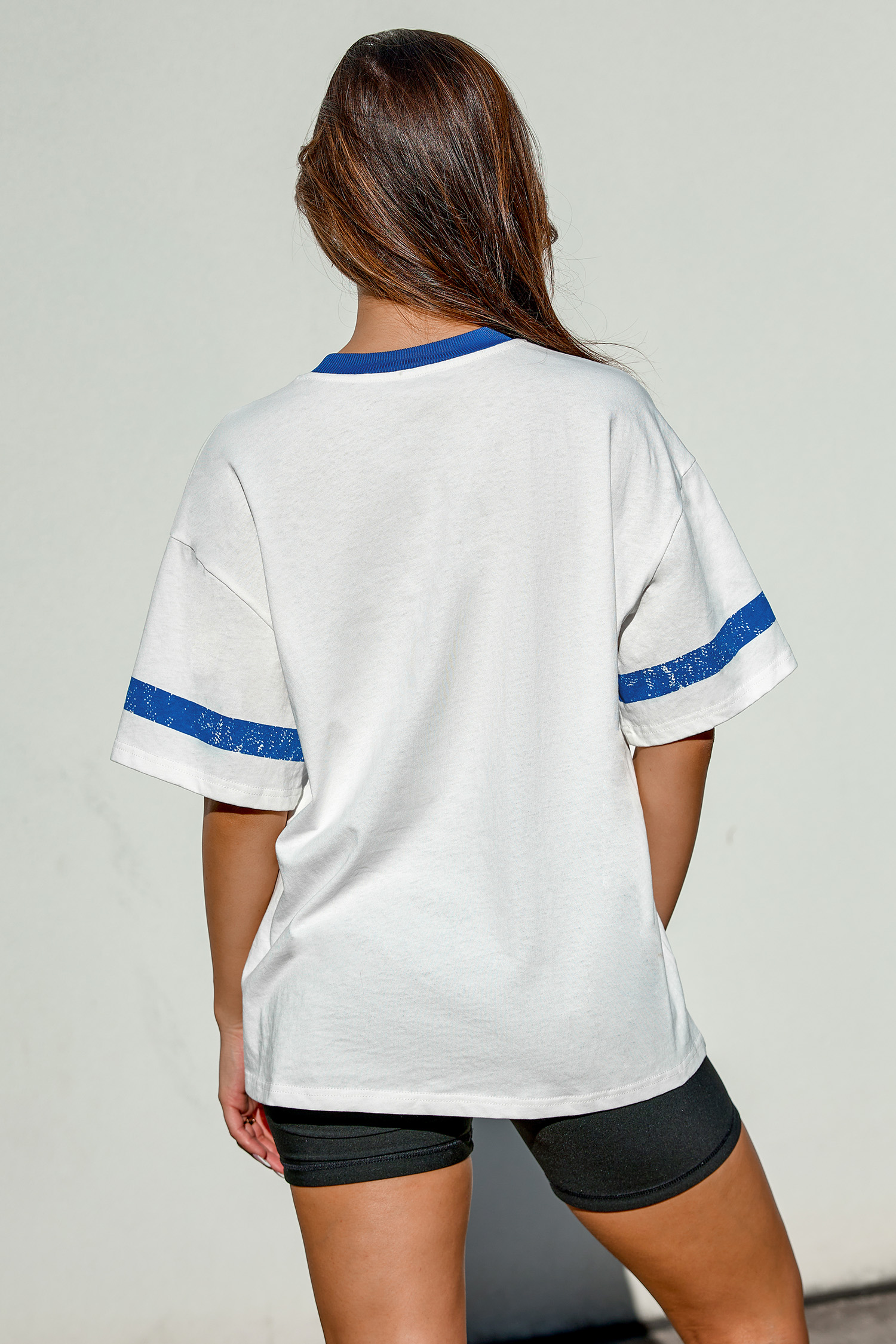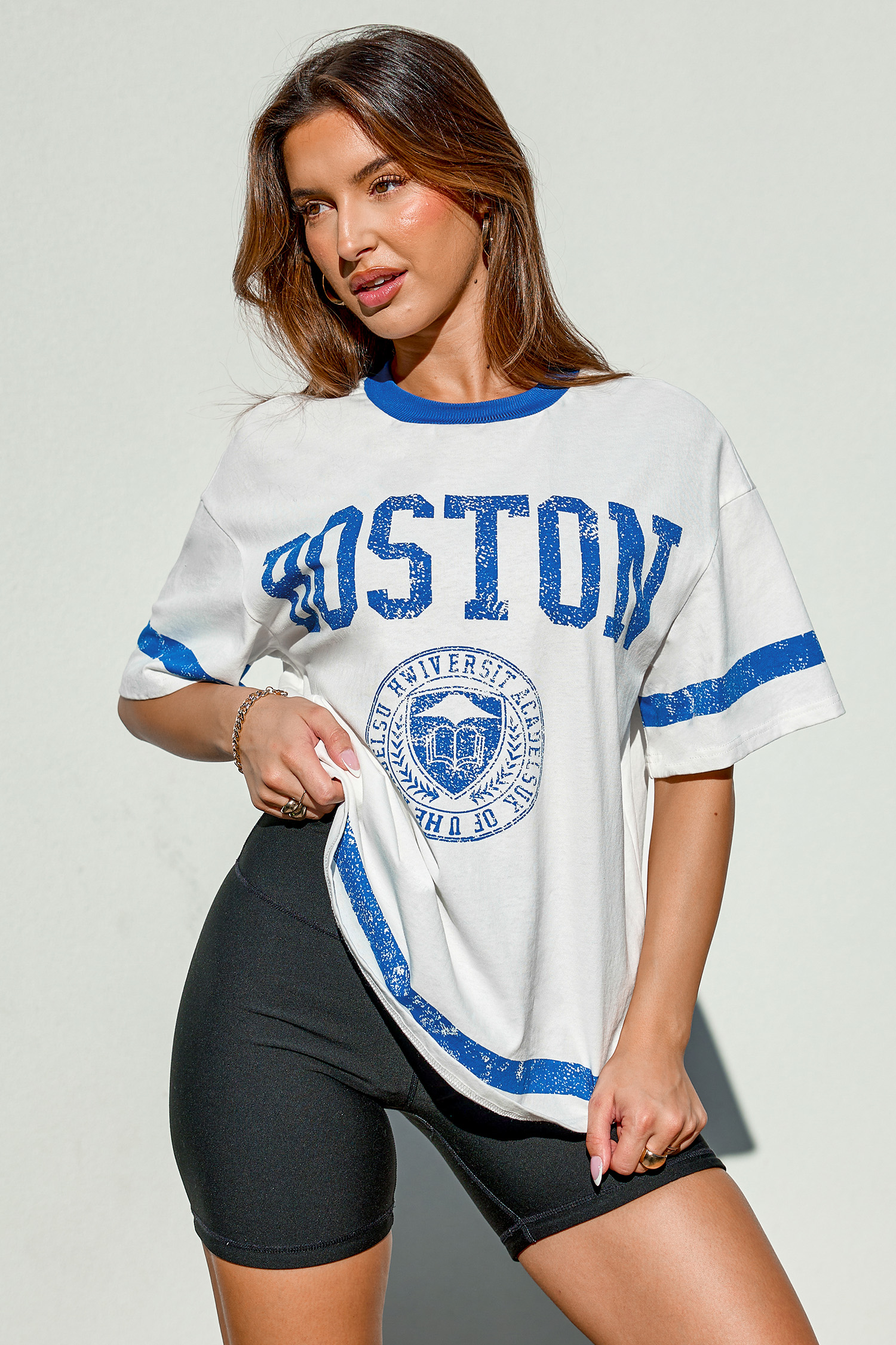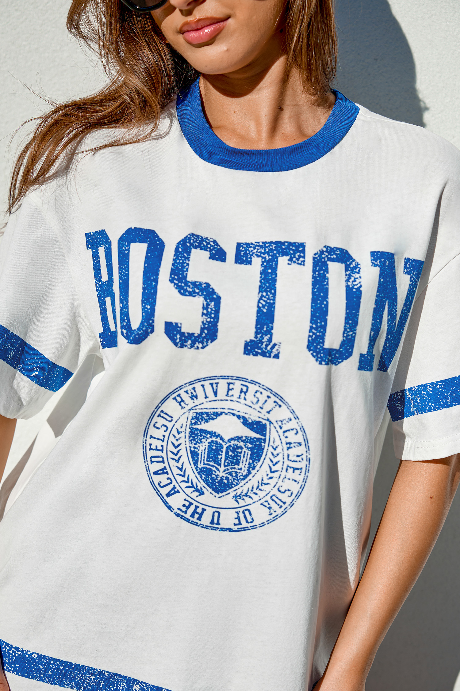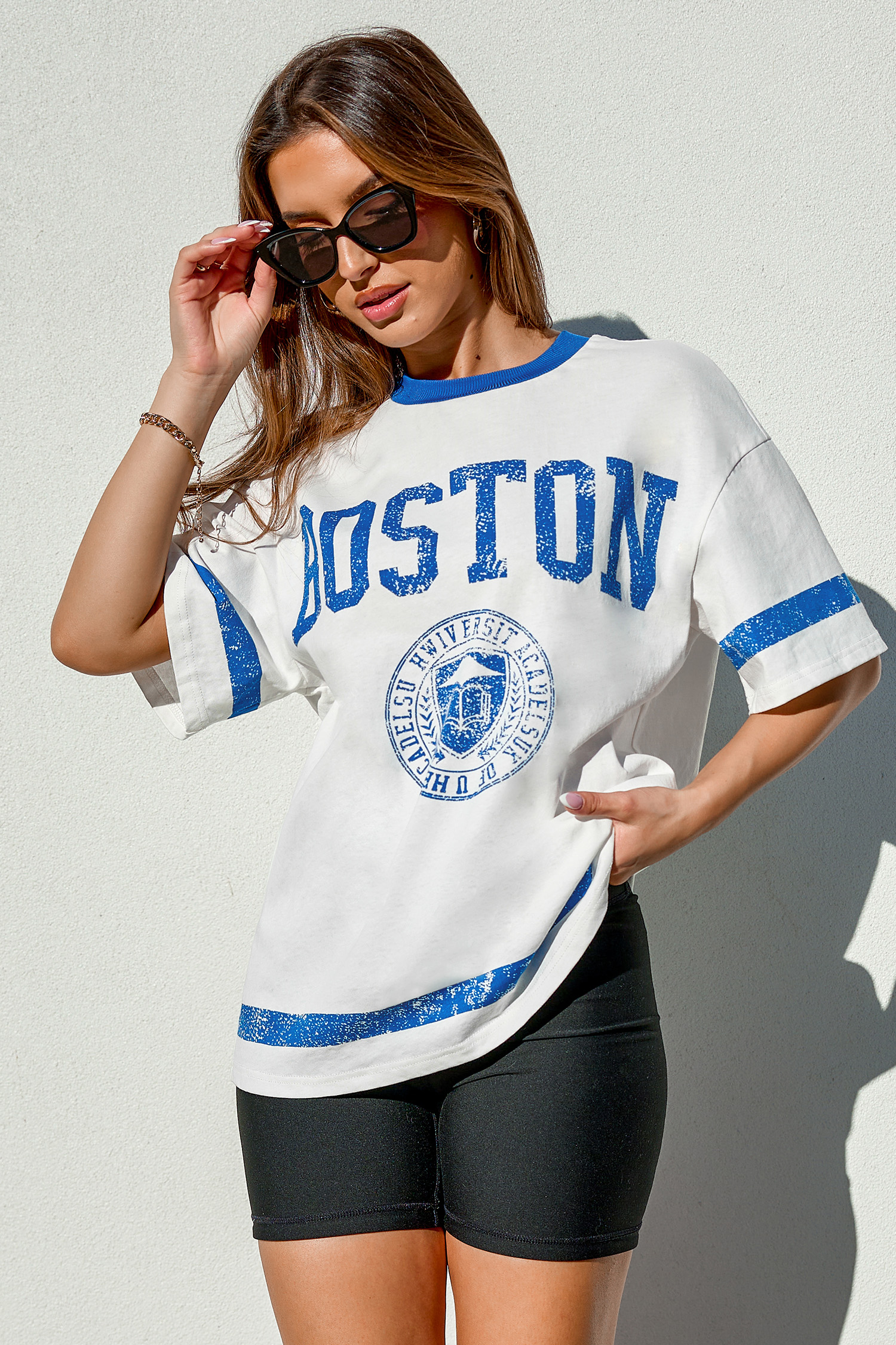 HomeWhite & Blue Round Neck Short Sleeve Boston Tee
