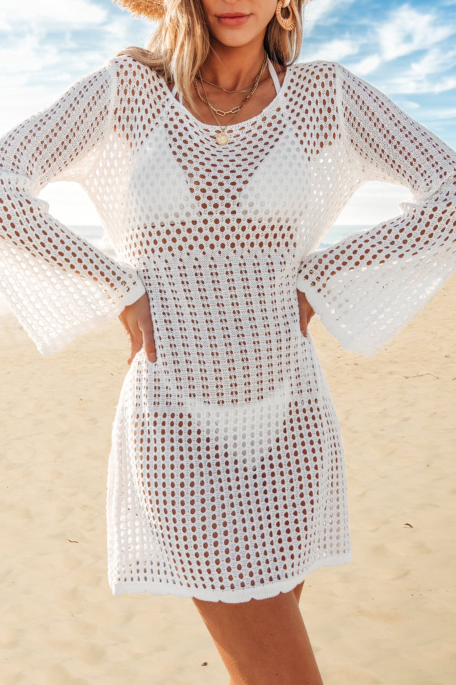The White Cutout Flared Sleeve Cover-up Dress is a breezy and elegant choice for your beach days. With its delicate cutout details and flowy flared sleeves, it adds just the right touch of bohemian charm to your swimwear look.