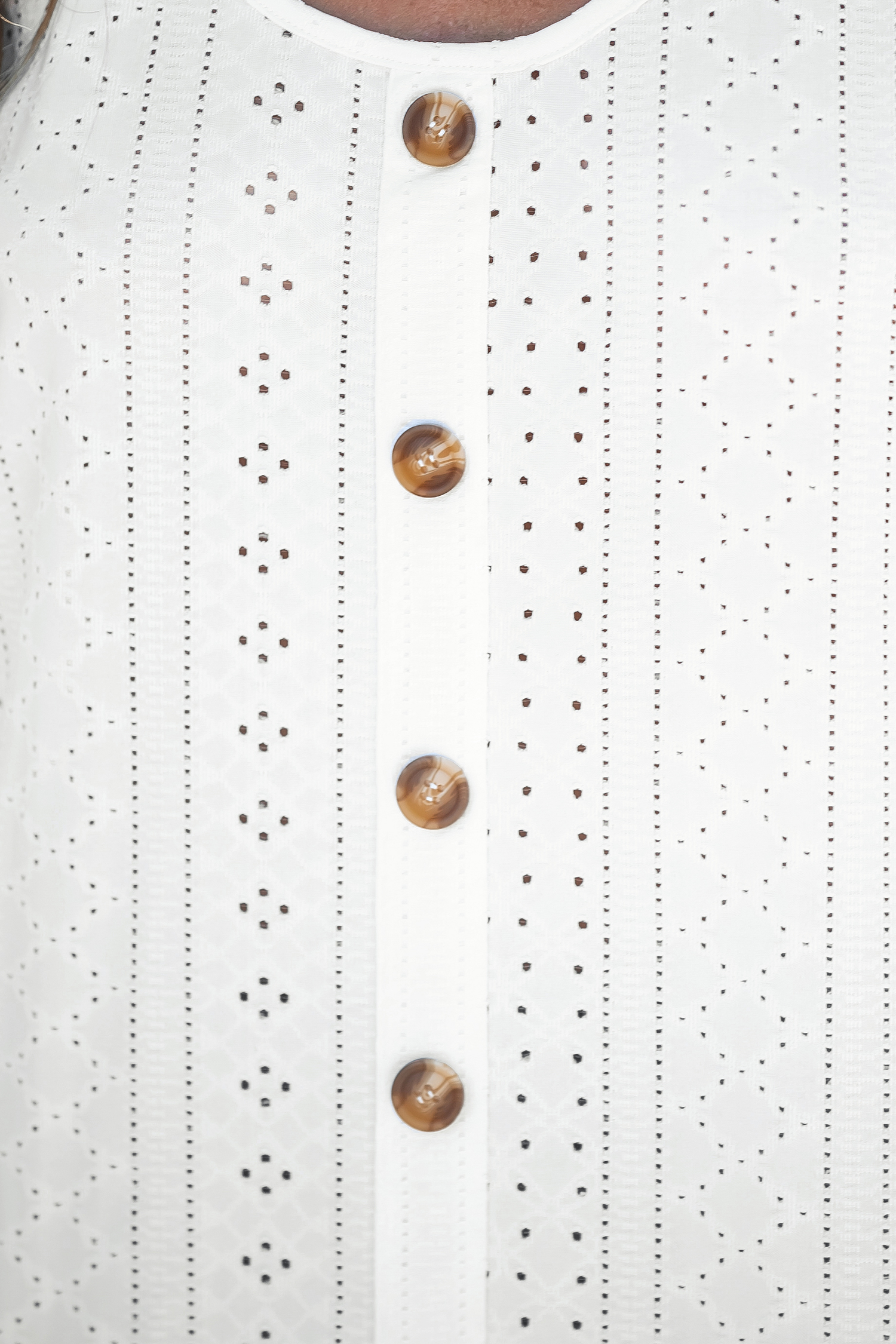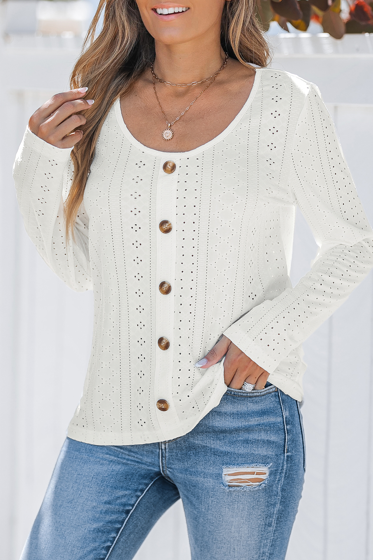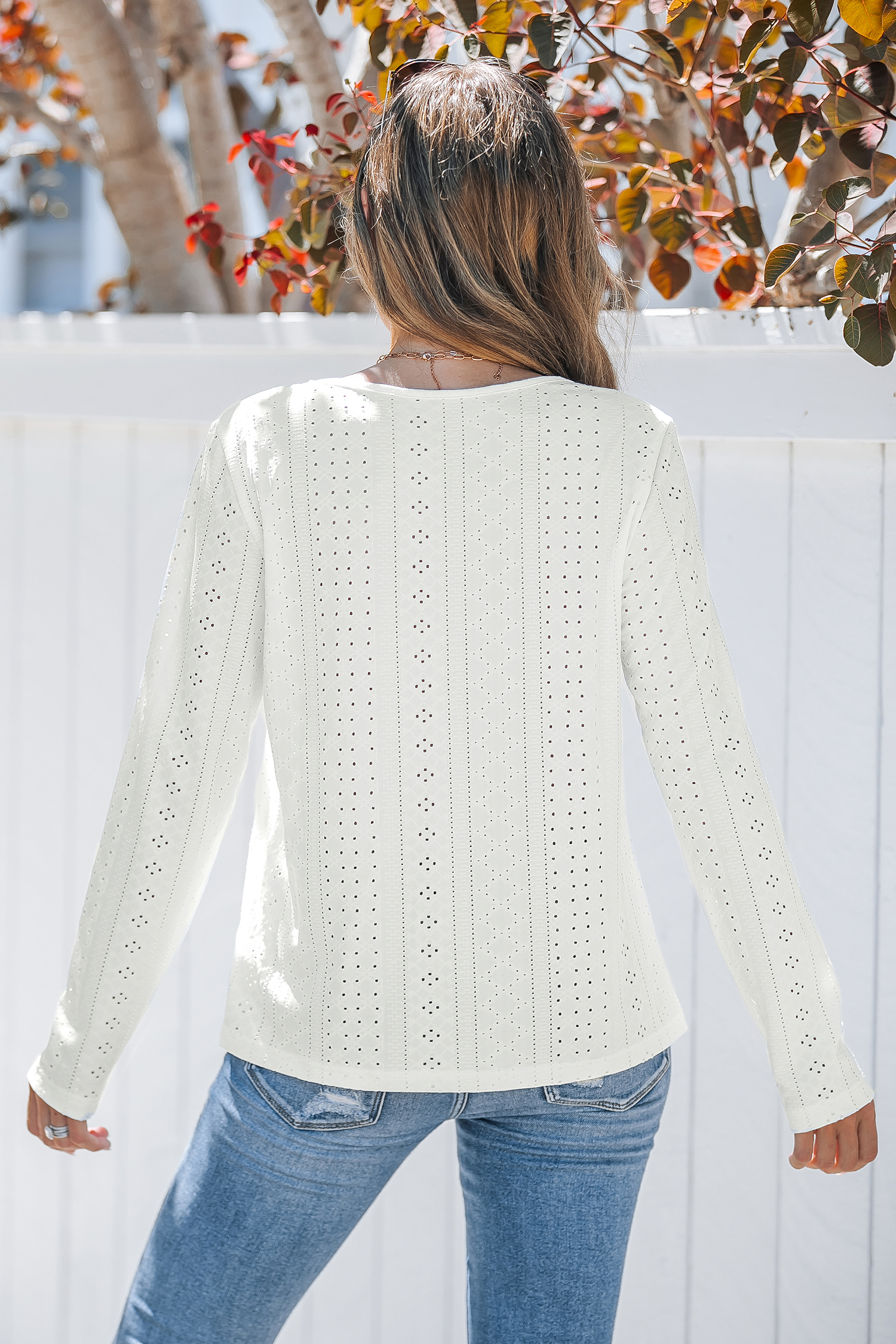 White Eyelet Jersey Scoop Neck Long Sleeve Top