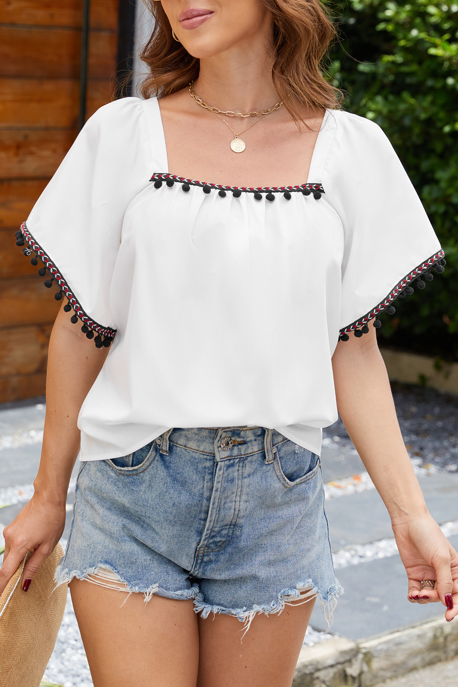 HomeWhite Square Neck Short Sleeve Pom-Pom Top